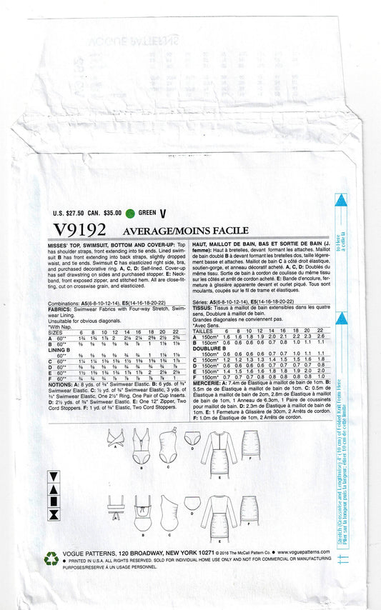 Patrón de costura para trajes de baño, bikini y pareo Vogue V9192 para mujer, tallas 6 a 14 o 14 a 22, sin cortar, doblado de fábrica