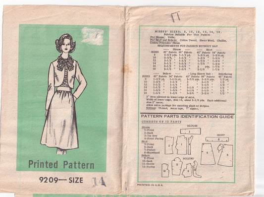 Mail Order 9209 Womens Neck Tied Blouse Skirt & Bolero Jacket 1970s Vintage Sewing Pattern Size 14 Bust 36 Inches UNCUT Factory Folded
