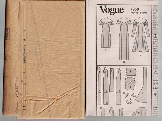 Vogue 7958 Womens Ruched Sleeve Evening Princess Dress with Skirt Variations 1990s Vintage Sewing Pattern Size 12 - 16 UNCUT Factory Folded