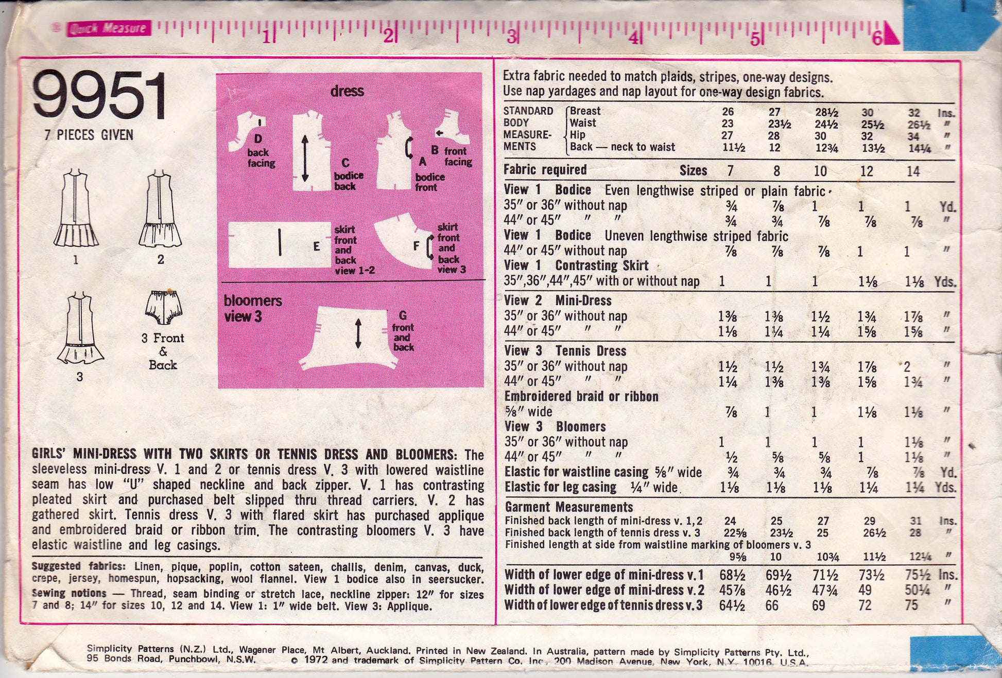 Patrón de costura vintage de los años 70 para vestido y pantalones bombachos de cintura baja para niñas Simplicity 9951, talla 10