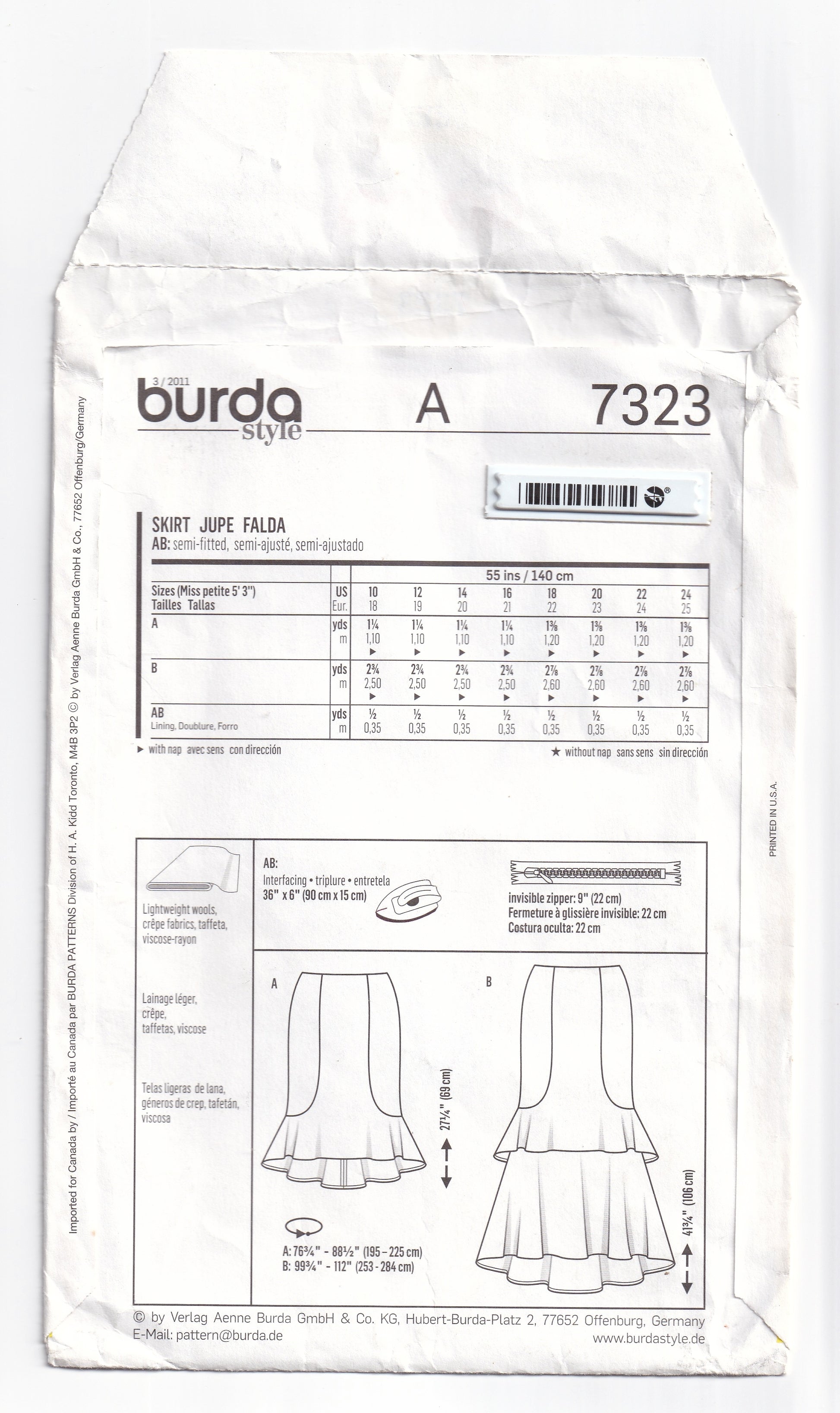 Burda 7323 Womens Side Panelled Ruffled Skirt with Optional Tiers Out Of Print Paper Sewing Pattern Sizes 8 - 18 UNCUT Factory Folded
