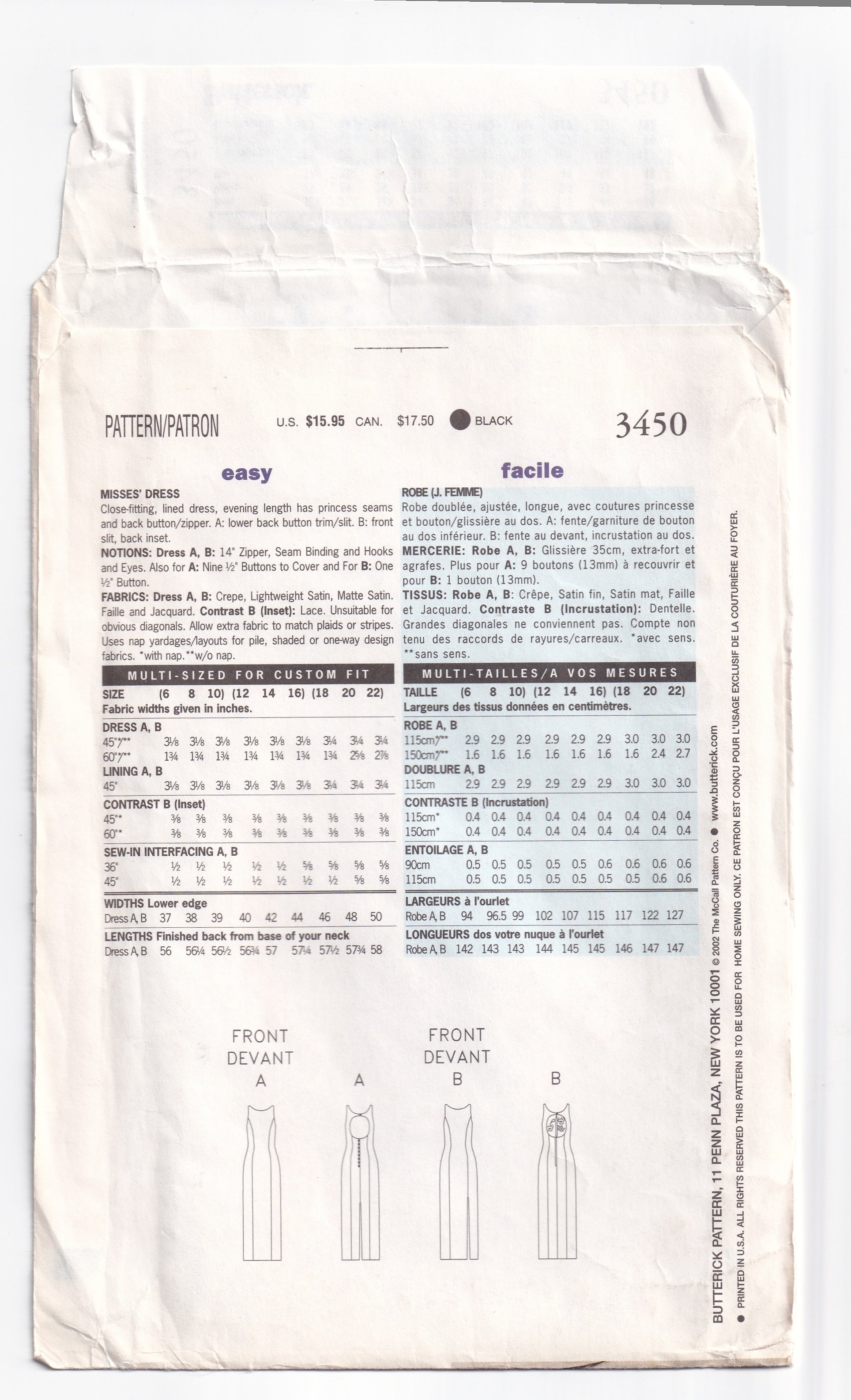 Butterick 3450 sewing pattern, dated 2002, now out of print.