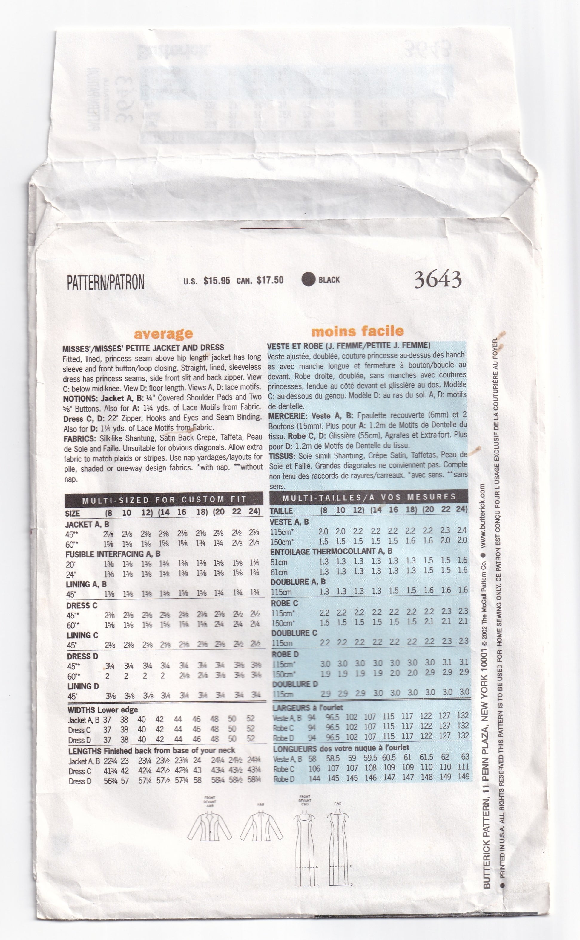 Butterick 3643 out of print paper sewing pattern, dated 2011.