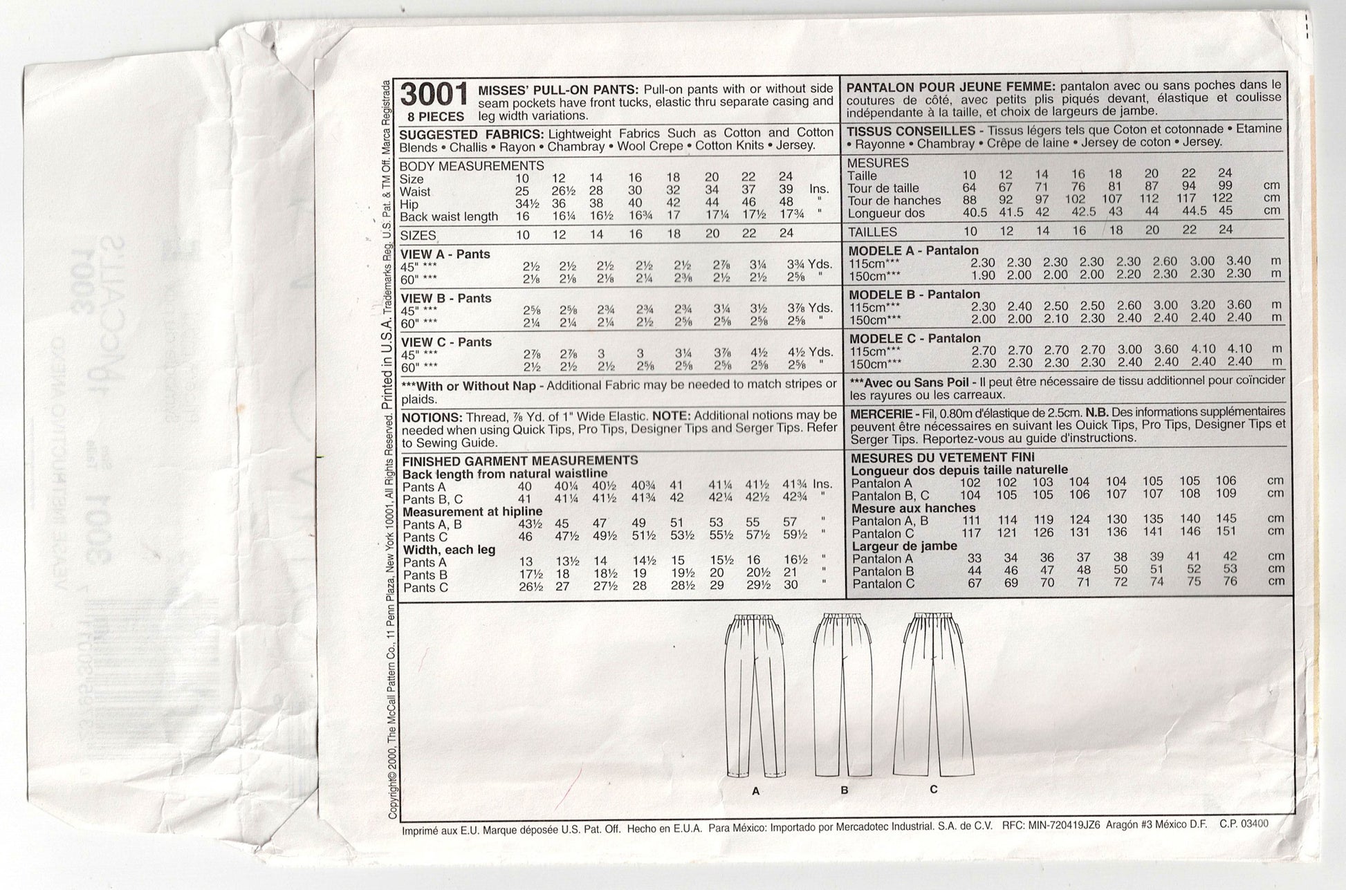 McCall's 3001 Womens PALMER PLETSCH Classic Fit Pants with Tapered or Wide Legs Out Of Print Sewing Pattern Size 10 UNCUT Factory Folded