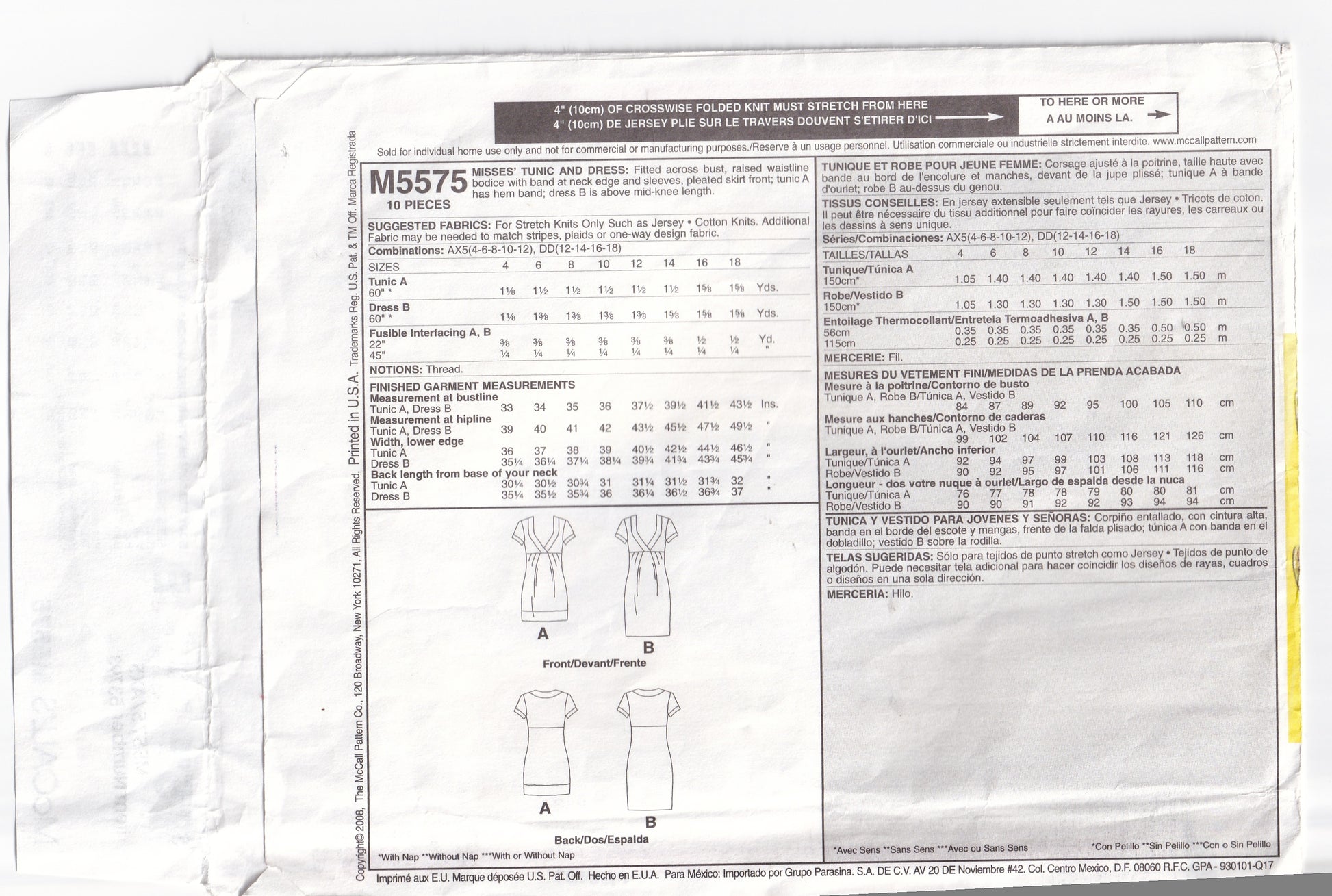 McCall's 5575 sewing pattern, dated 2008, now out of print.