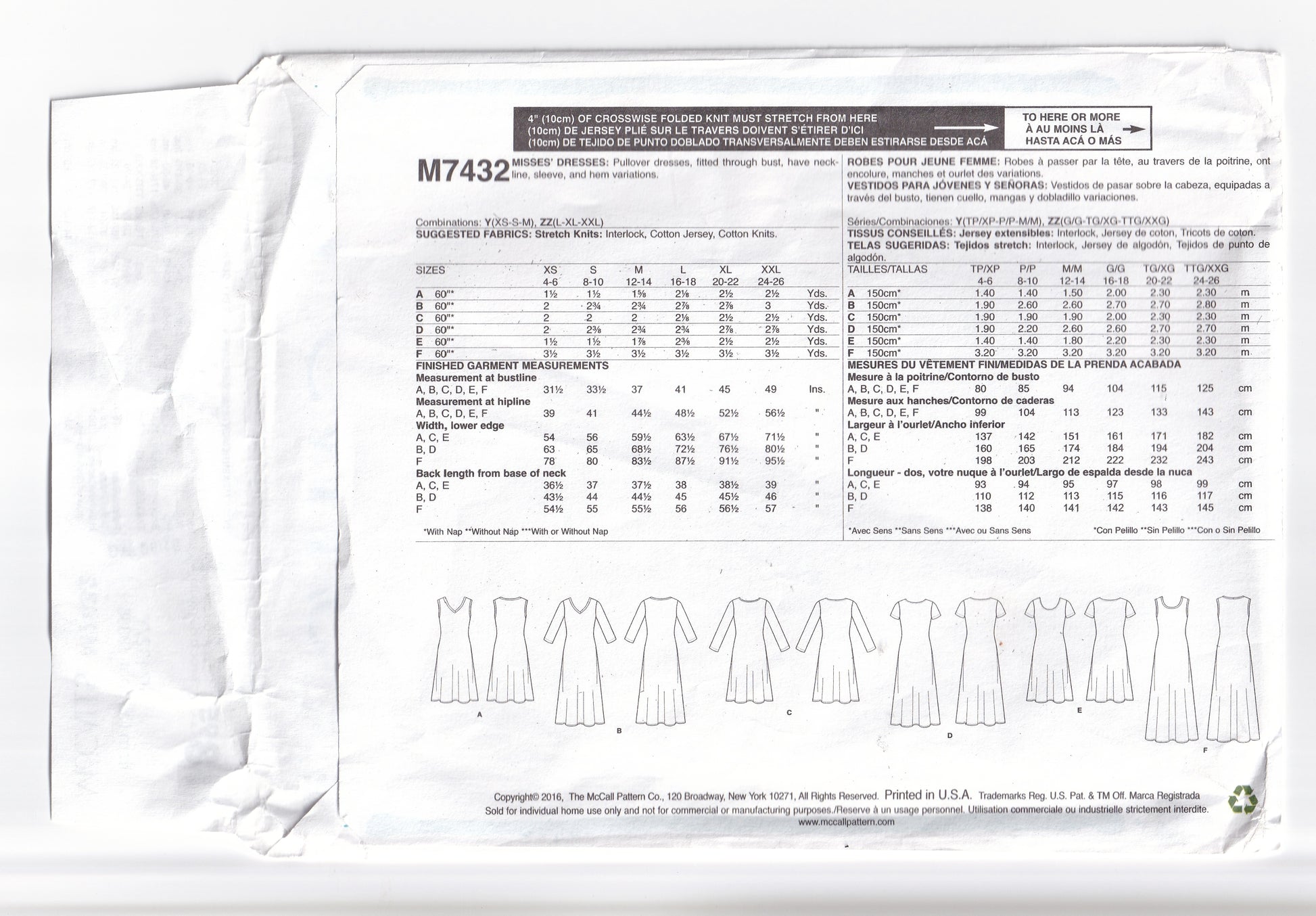 McCall's M7432 sewing pattern, dated 2016, now out of print.