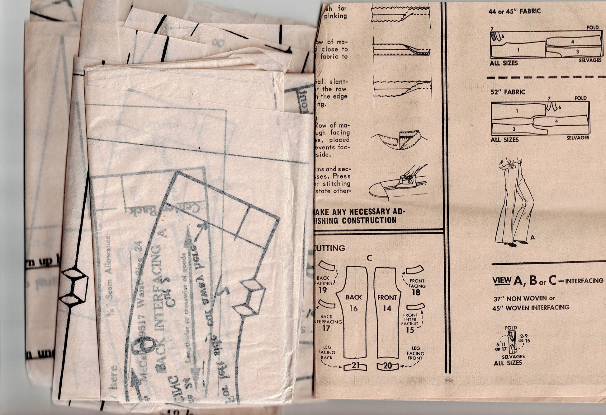 Long pants in three versions, have darted, faced and interfaced upper edges and left size zippers. Pants legs may be wide bell bottoms, stovepiped or flared turned back to form cuffs. Six section bell bottoms have panel seaming in back. Stovepiped legs are faced.