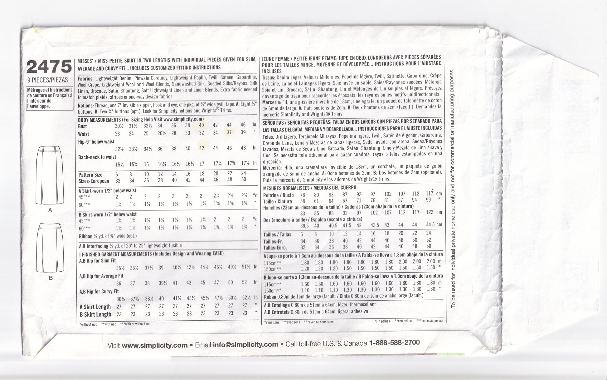 Misses' & Miss petite skirt sewing pattern in two lengths with individual pieces given for slim, average, and curvy fit.