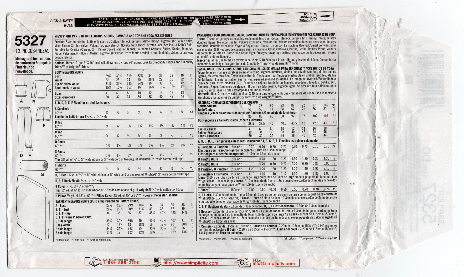 Patrón de costura Simplicity 5327 para ropa deportiva y accesorios de yoga elásticos para mujer, talla 4 a 10, sin cortar, doblado de fábrica