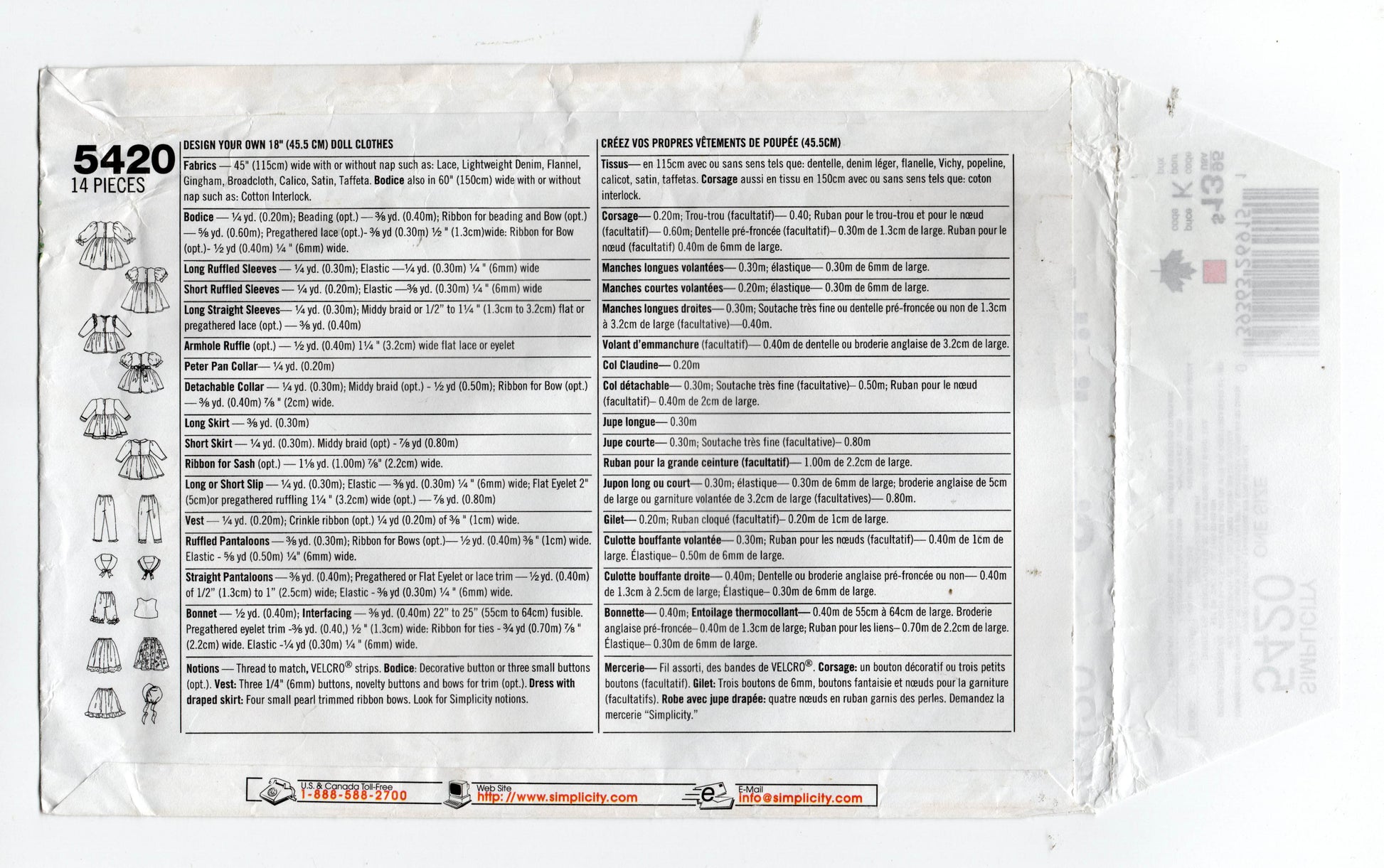 Patrón de costura Simplicity 5420 para ropa de muñecas, fechado en 2002, ahora agotado.
