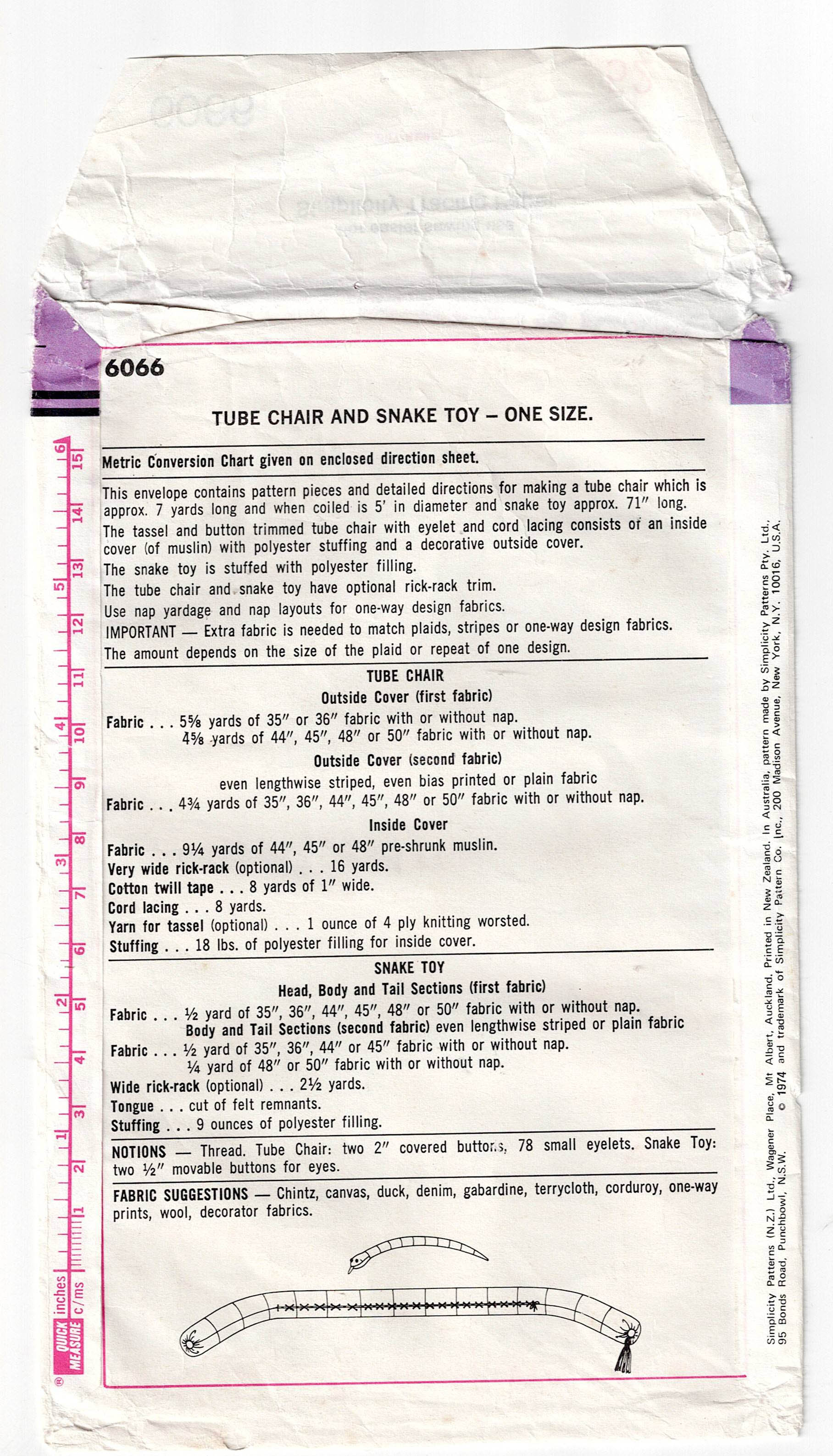 El sobre contiene piezas de patrón e instrucciones detalladas para hacer una silla tubular de aproximadamente 7 yardas de largo y cuando está enrollada tiene 5' de diámetro. El patrón también sirve para hacer un juguete de serpiente de 71" de largo. La silla tubular adornada con borlas y botones con ojales y cordón para atar consta de una funda interior (de muselina) con relleno de poliéster y una funda exterior decorativa. El juguete de serpiente está relleno de poliéster. La silla tubular y el juguete de serpiente tienen un borde de zigzag opcional.
