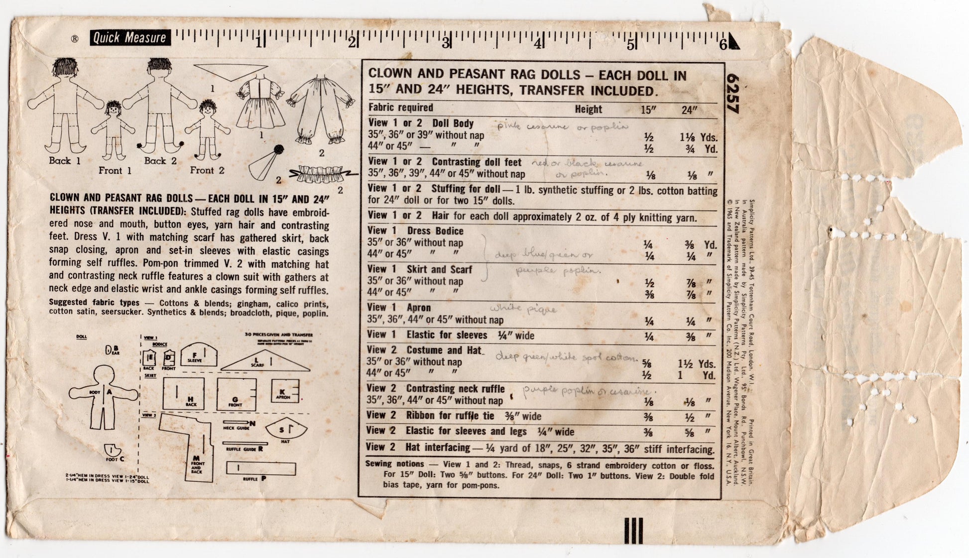 Patrón de costura vintage de los años 60 Simplicity 6257, muñecos de payaso y campesino retro, juguetes de peluche, doblados de fábrica, sin cortar