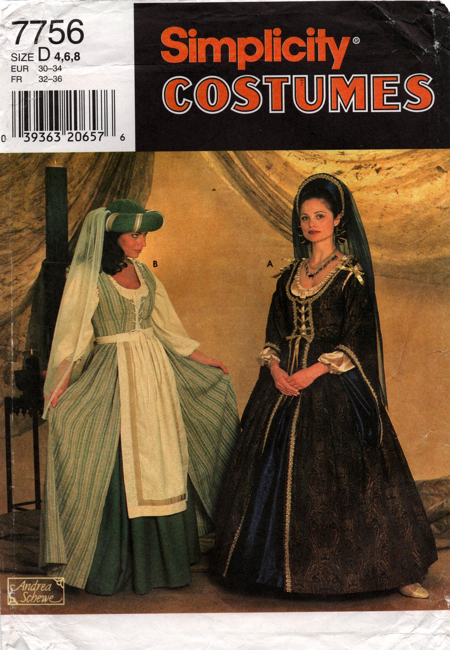 Patrón de costura Simplicity 7756 para traje de realeza renacentista para mujer, década de 1990, talla 4-8, sin cortar, doblado de fábrica
