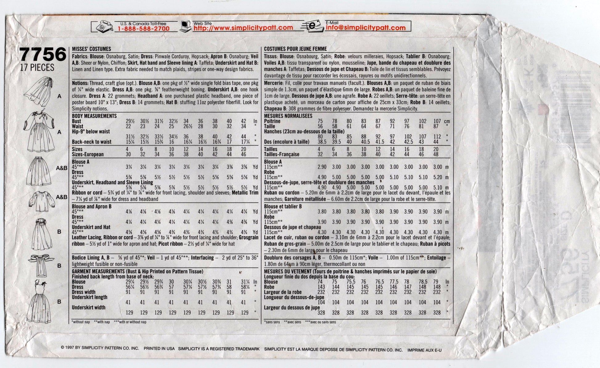 Patrón de costura vintage Simplicity 7756, fechado en 1996.