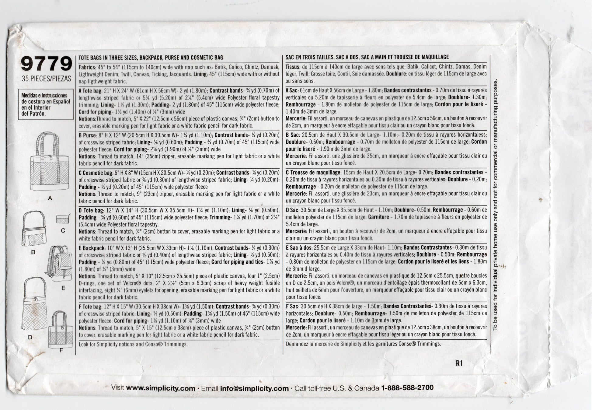 Patrón de costura agotado para bolsos de mano para mujer Simplicity 9779, bolso cosmético, mochila y bolso, sin cortar, pliegues de fábrica