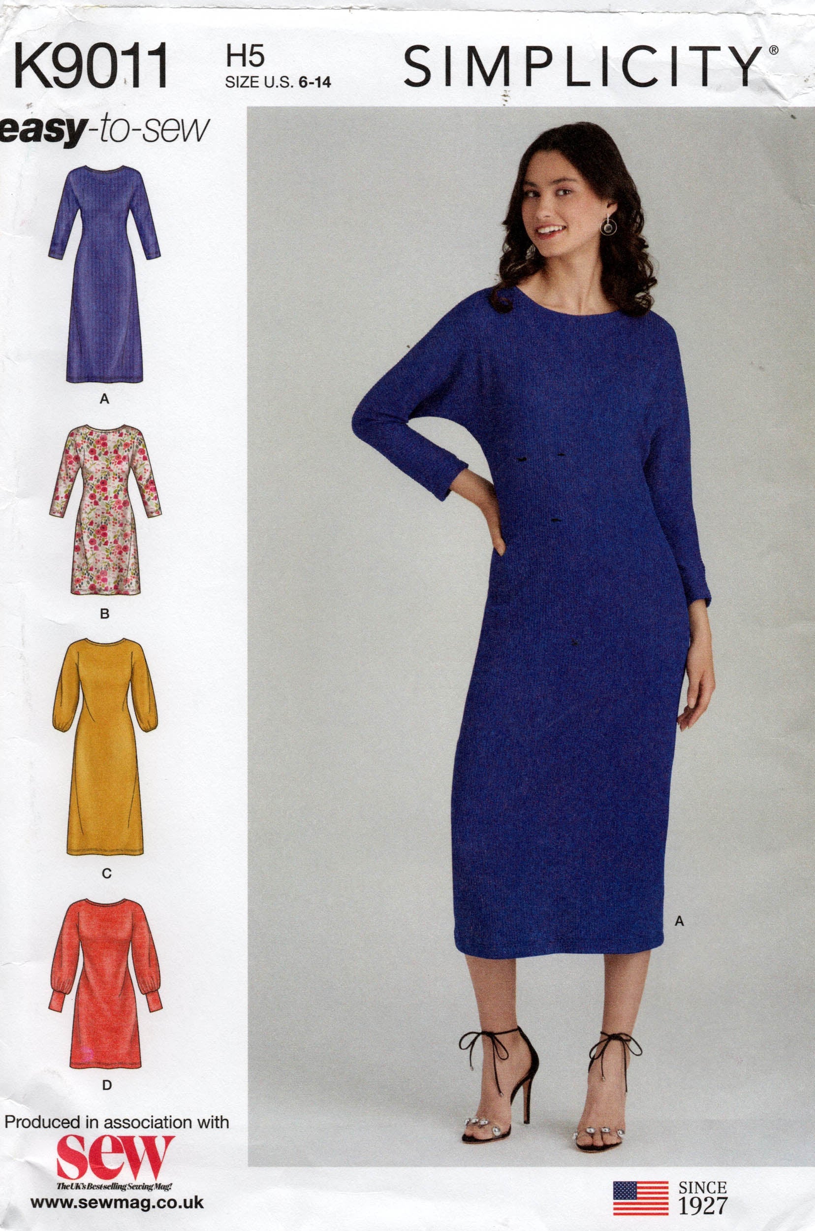 Patrón de costura de vestido jersey elástico fácil de usar Simplicity K9011 para mujer, fuera de estampado, talla 6-14, sin cortar, doblado de fábrica