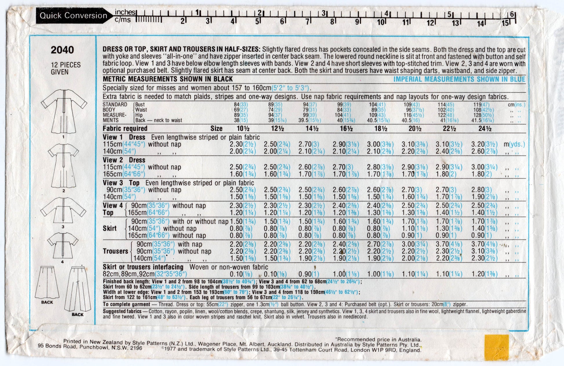 Patrón de costura vintage de los años 70, estilo 2040, para mujer, vestido, blusa, falda y pantalones de talla media, talla 10 1/2 y 12 1/2, sin cortar, doblado de fábrica
