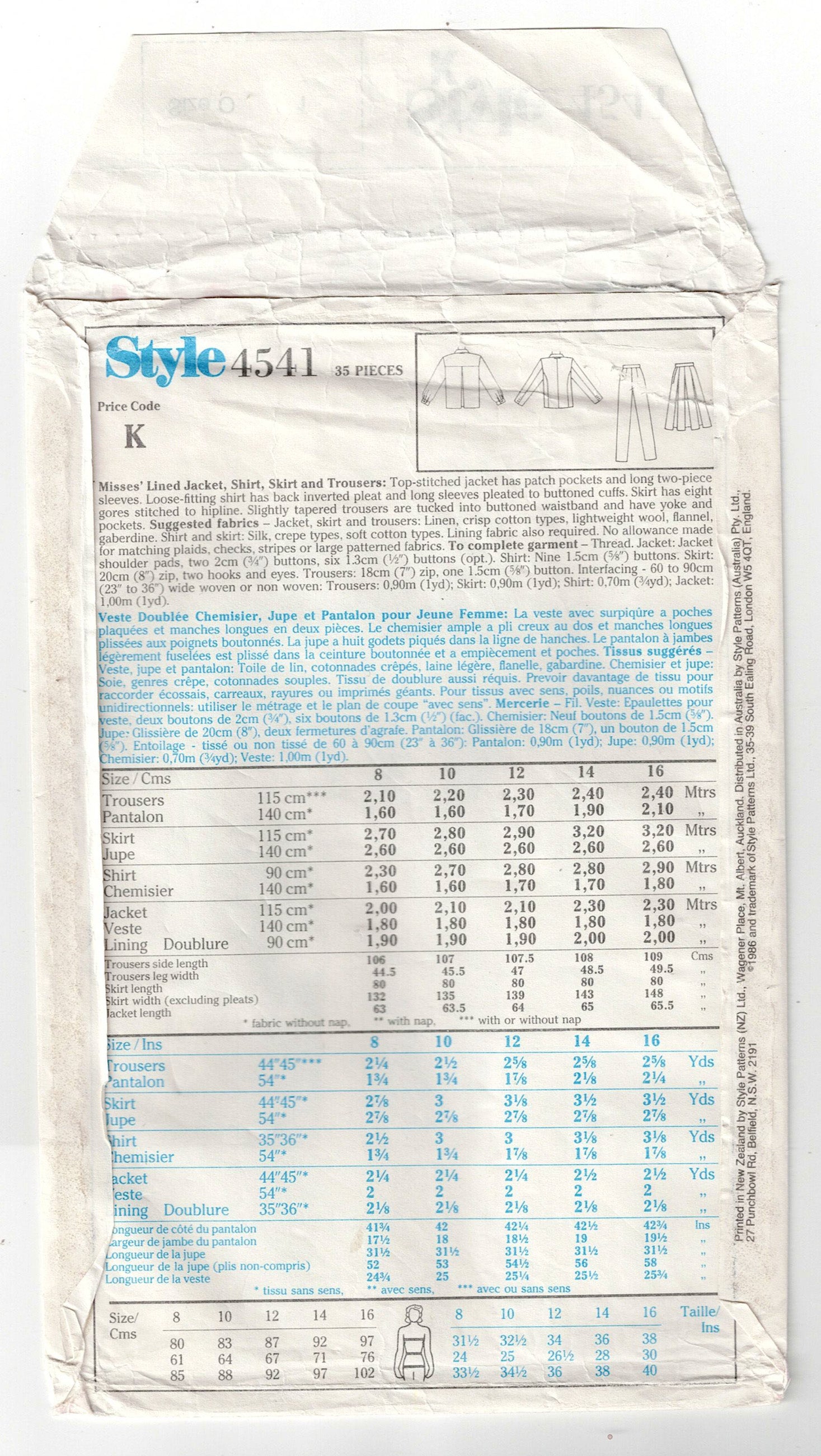Style 4541 Womens Wardrobe Jacket Shirt Skirt & Pants 1980s Vintage Sewing Pattern 12 - 16 UNCUT Factory Folded