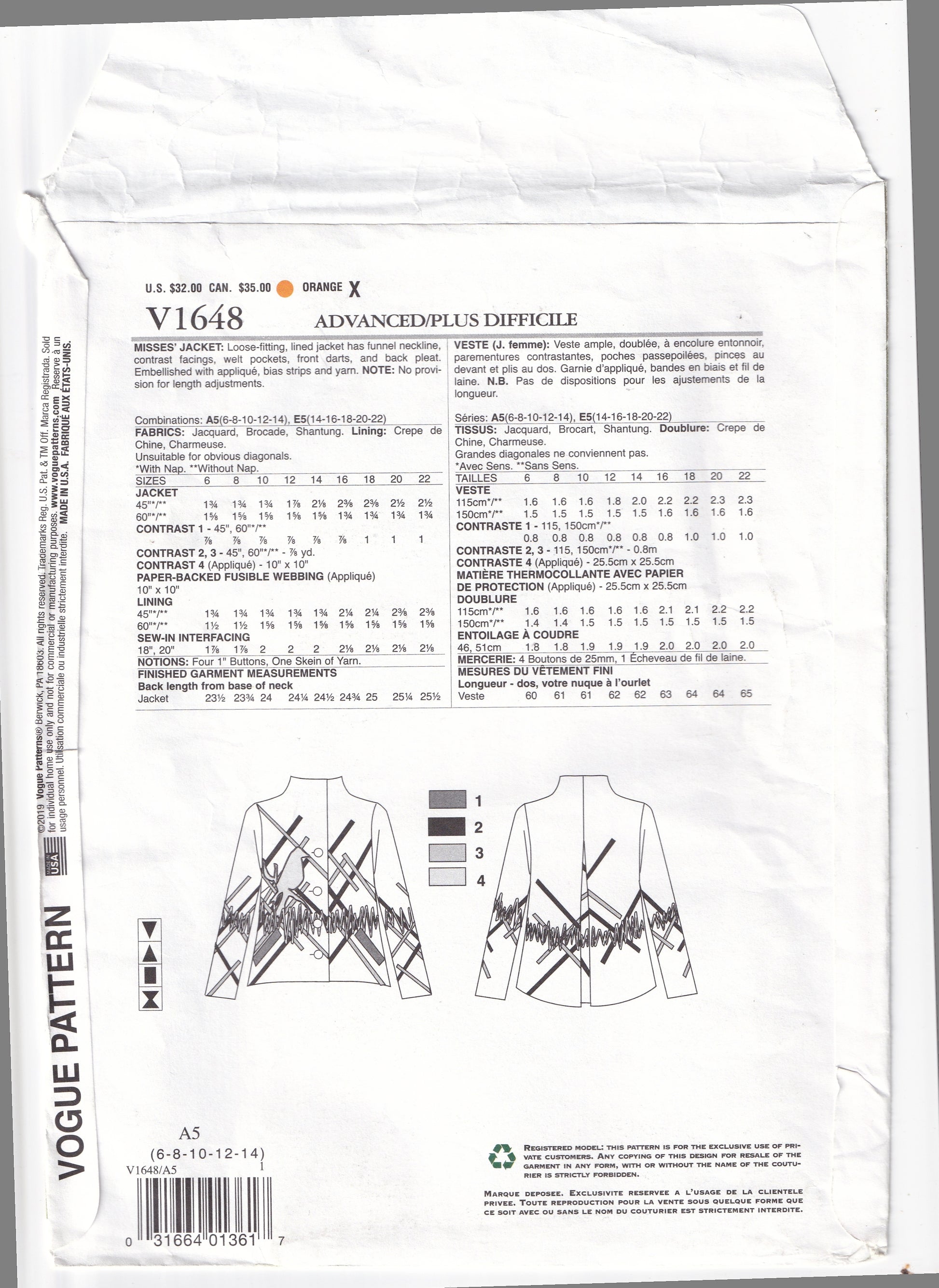 Vogue Designer Original 1648 JULIO CESARE Womens Lined Funnel Neck Jacket with Applique Detail Out Of Print Sewing Pattern Size 6 - 14 UNCUT Factory Folded
