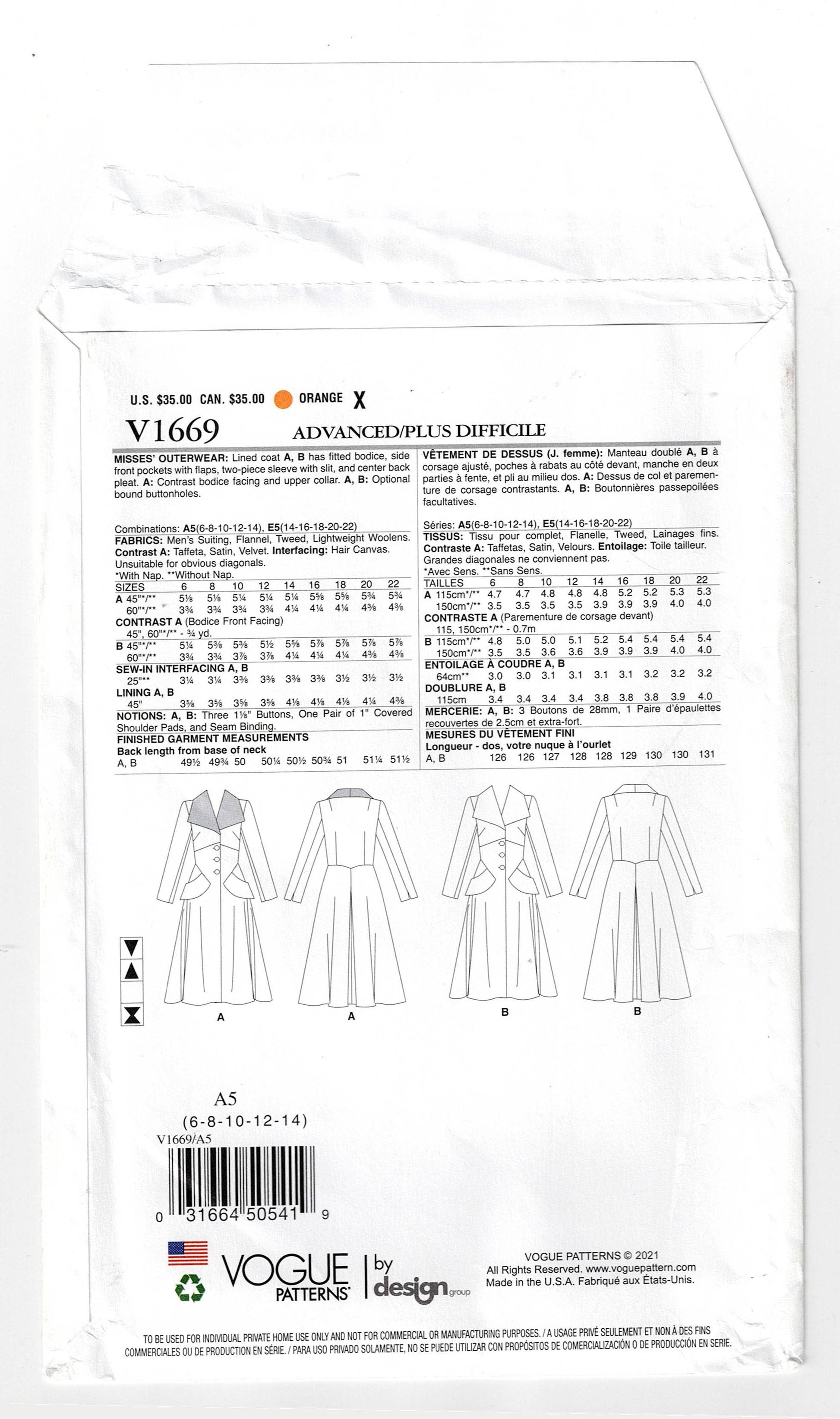 Patrón de costura de la década de 1940 reeditado con diseño original de Vogue V1669 de 1949, abrigo con corpiño ajustado y cuello alto ancho, tallas 6 a 14, doblado de fábrica sin cortar