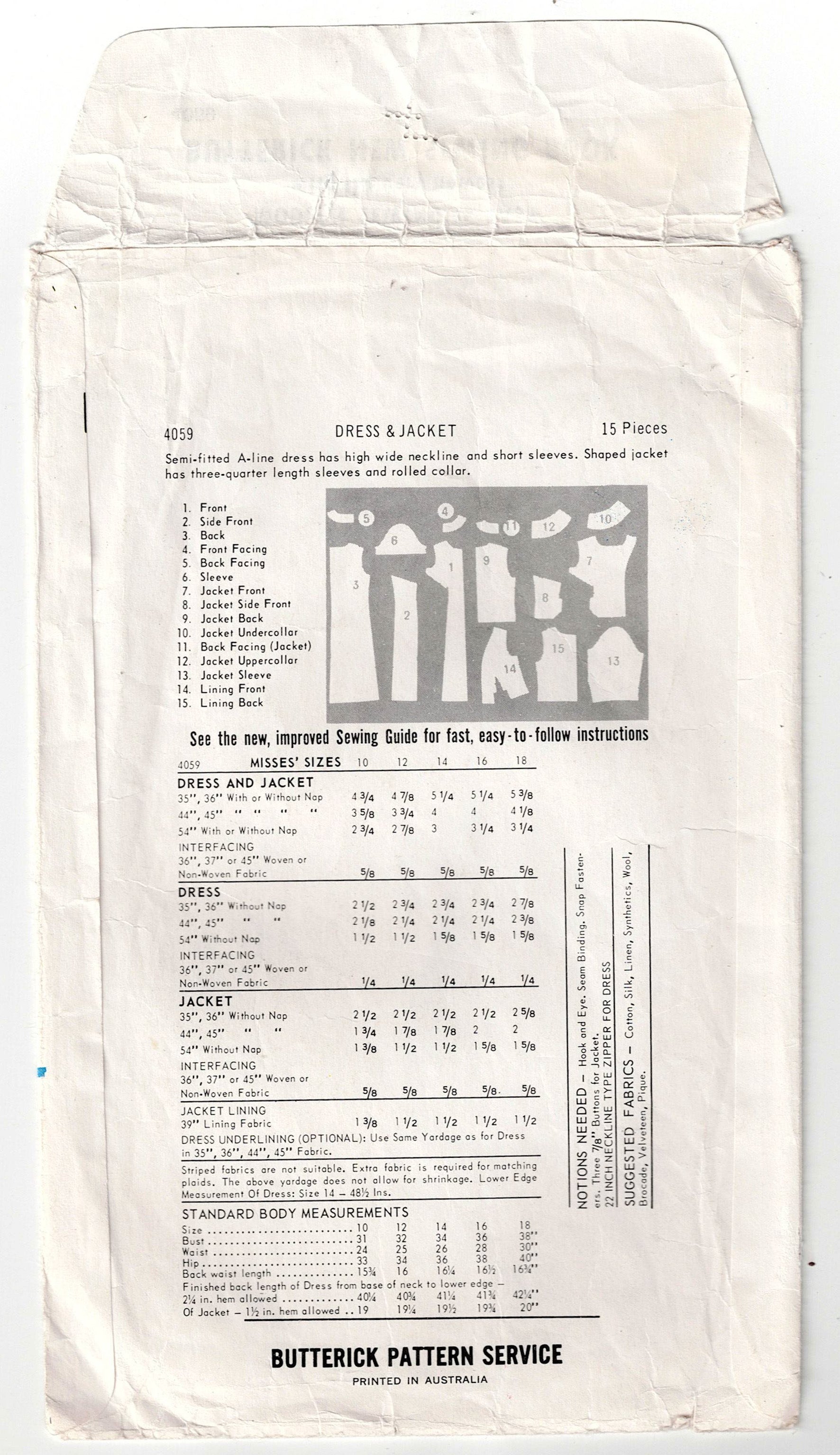 Butterick 4059 Womens Shift Dress & 3/4 Sleeved Jacket 1960s Vintage Sewing Pattern Size 16 Bust 36 inches