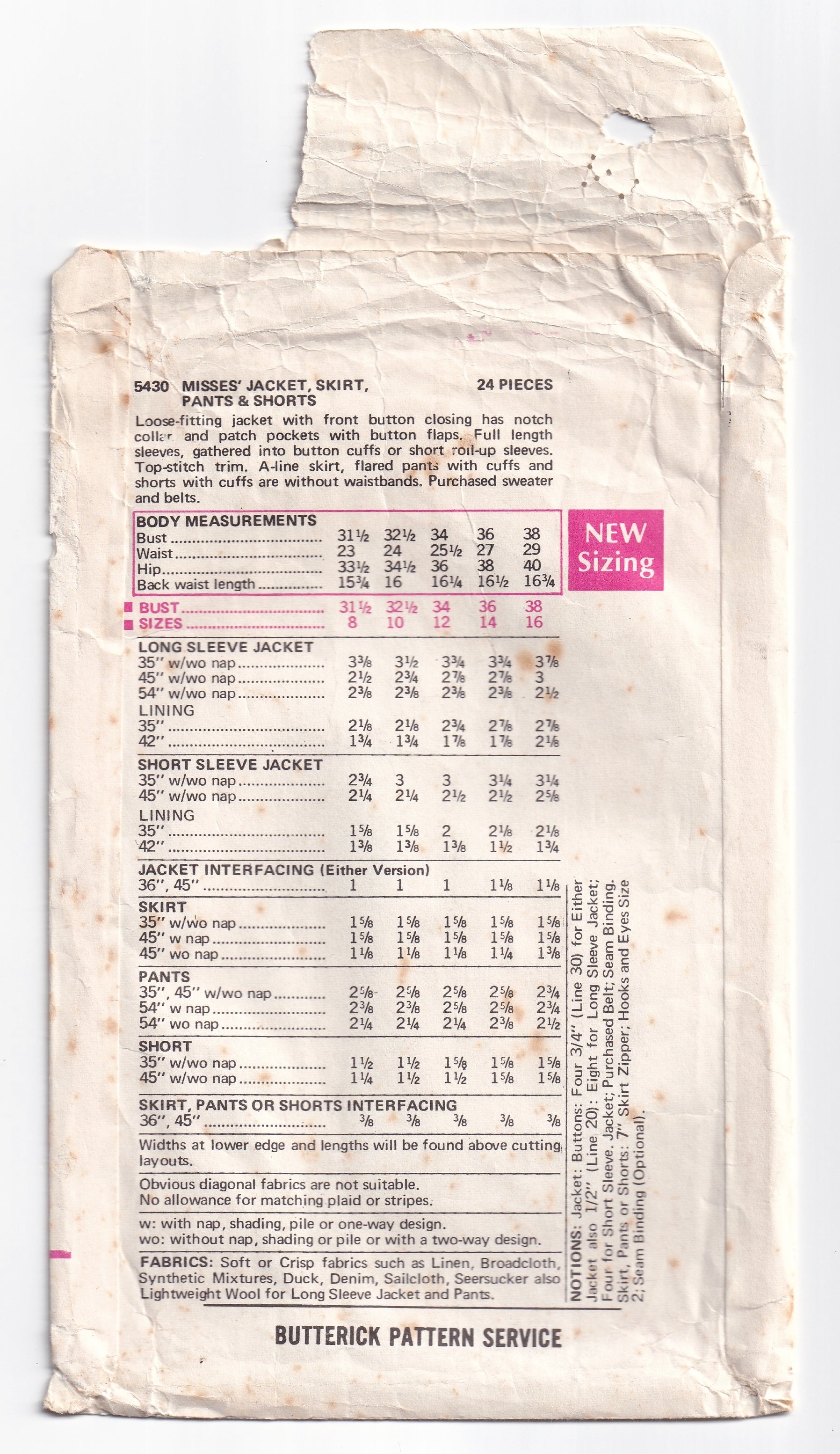 Butterick 5430 vintage paper sewing pattern, dated 1969.