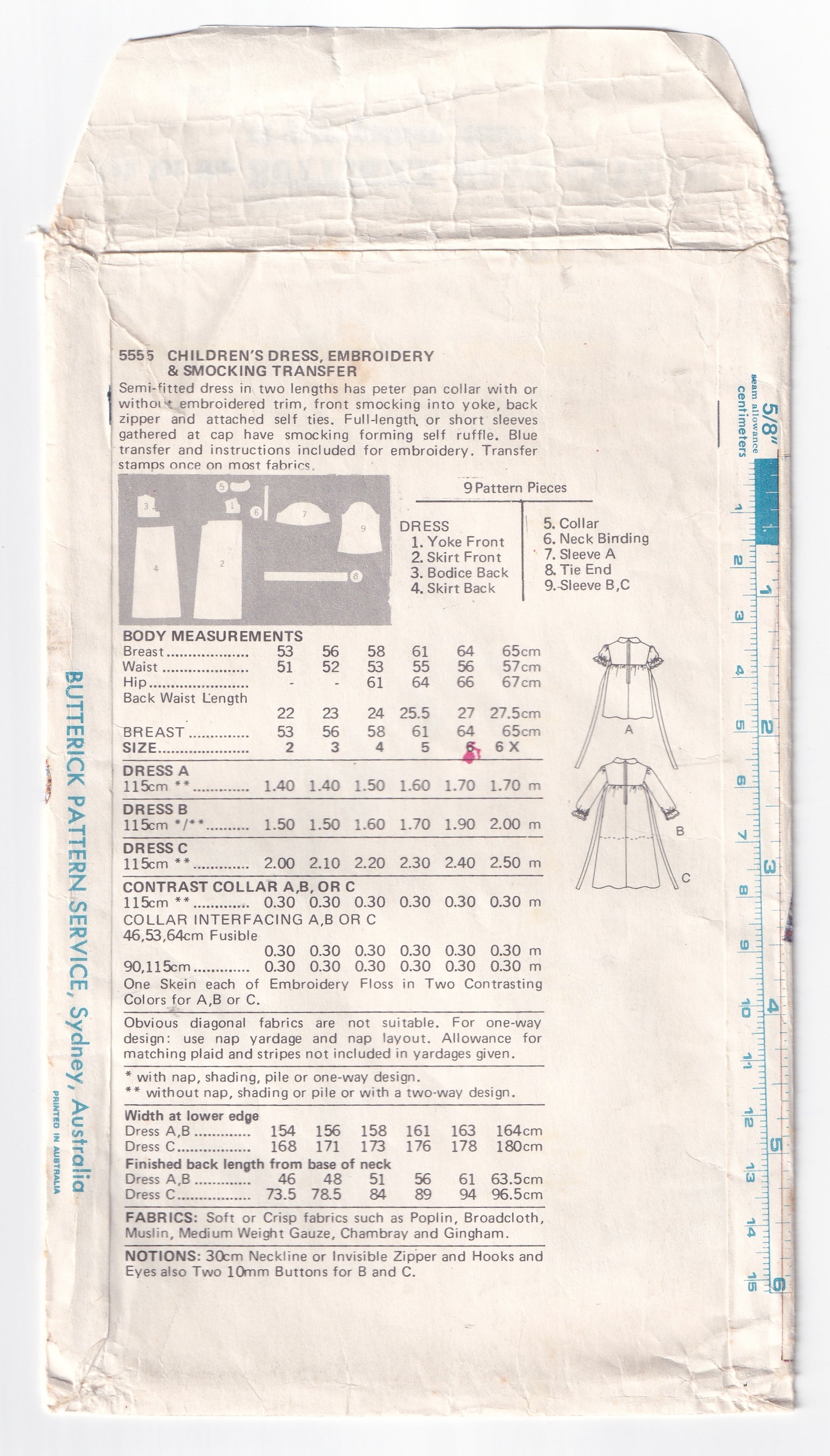 Semi-fitted dress in two lengths, has Peter Pan collar with or without embroidered trim, front smocking into yoke, back zipper, and attached self ties. Full-length or short sleeves gathered at cap have smocking forming self ruffle. Blue transfer and instructions included for embroidery. Transfer stamps once on most fabrics.
