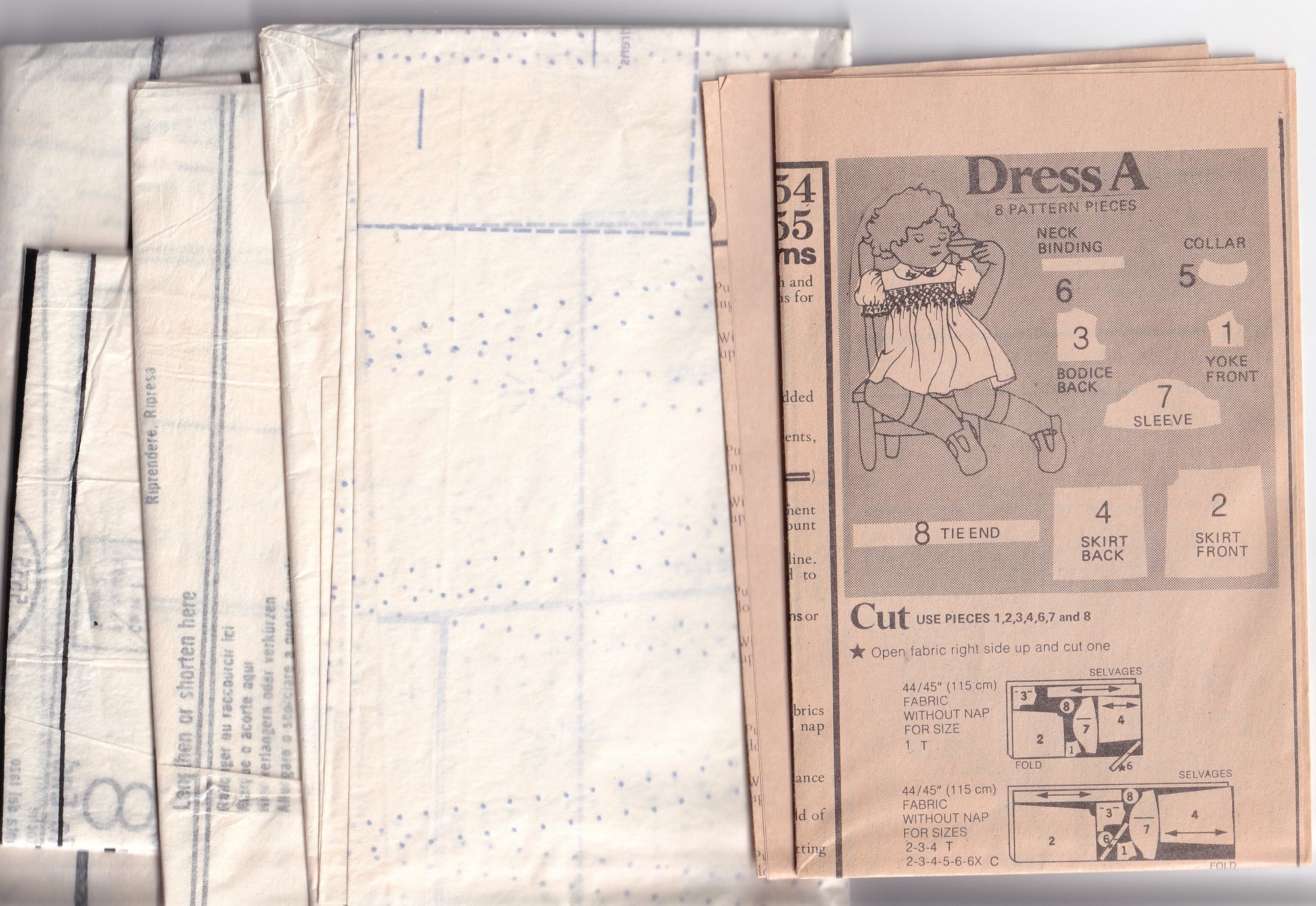 Pattern is cut and checked complete. Smocking/embroidery sheet is included, unused. Envelope is in good vintage condition.