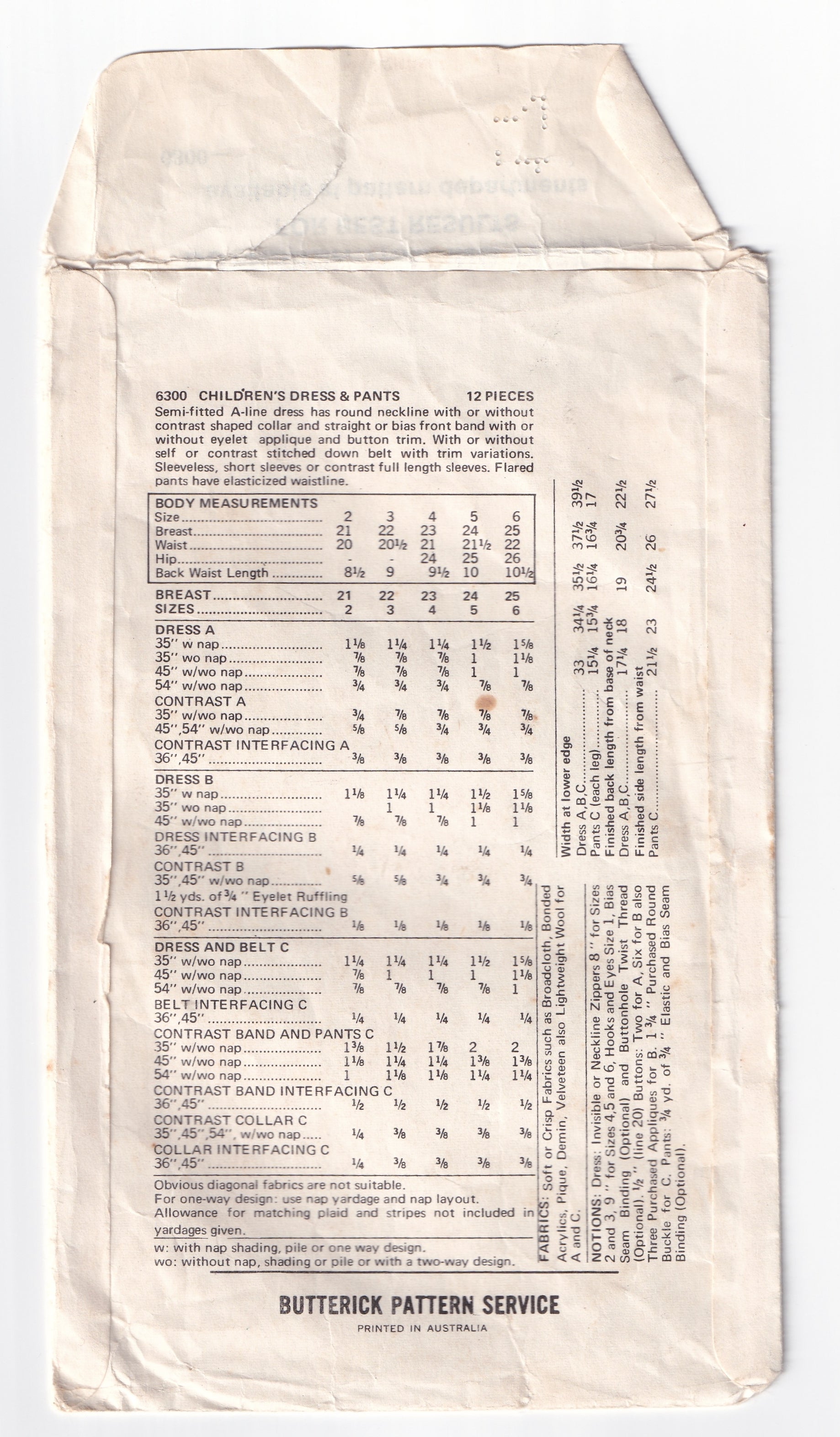 Butterick 6300 vintage sewing pattern, dated 1970s.