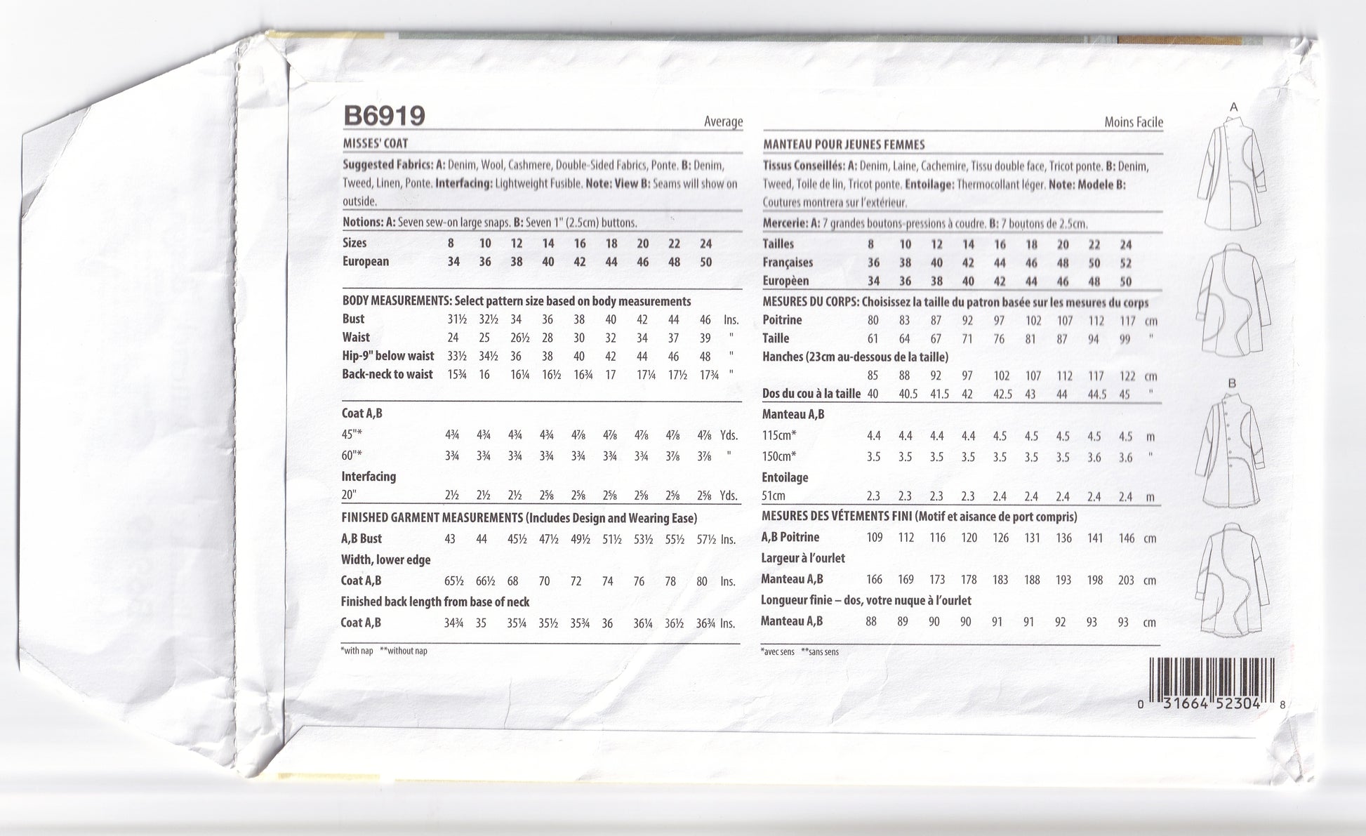 This is an asymmetric coat that has side seam pockets. View A has topstitching around the seams with hidden snap closure while B has raw edge outside seams and front buttons.