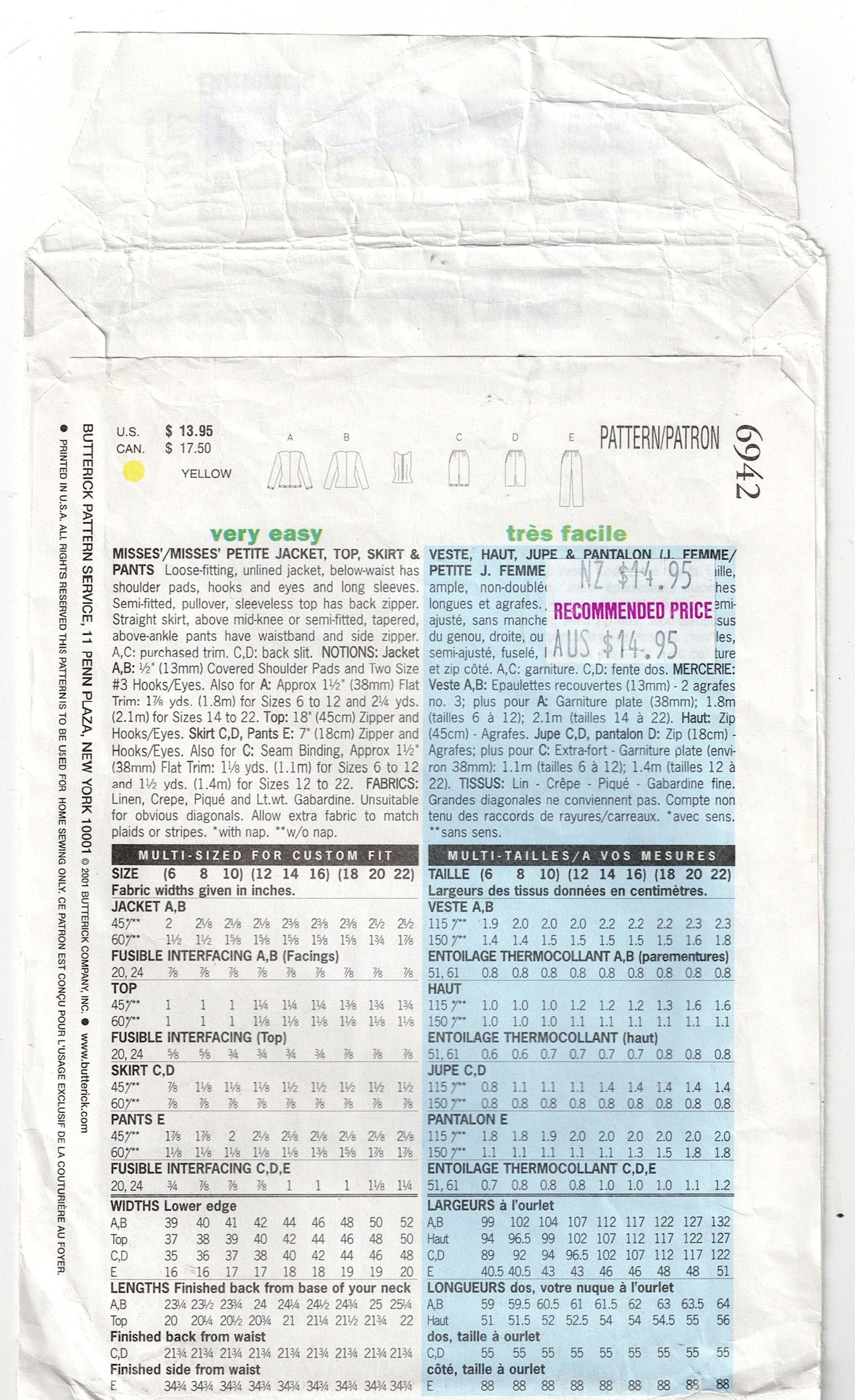 Butterick 6942 sewing pattern, dated 2001, now out of print.