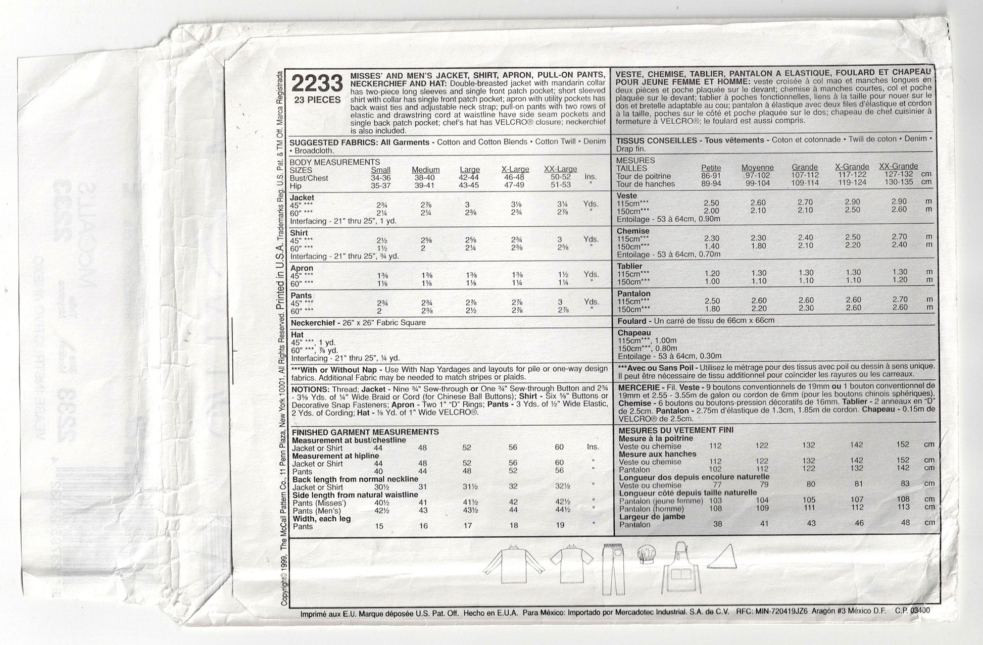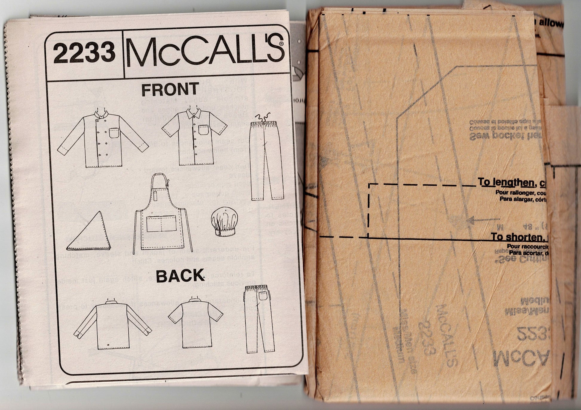 McCall's 2233 Mens Womens UNISEX Kitchen Aprons Chef Uniform & Hat 1990s Vintage Sewing Pattern Bust/Chest 38-40 Inches UNCUT Factory Folded
