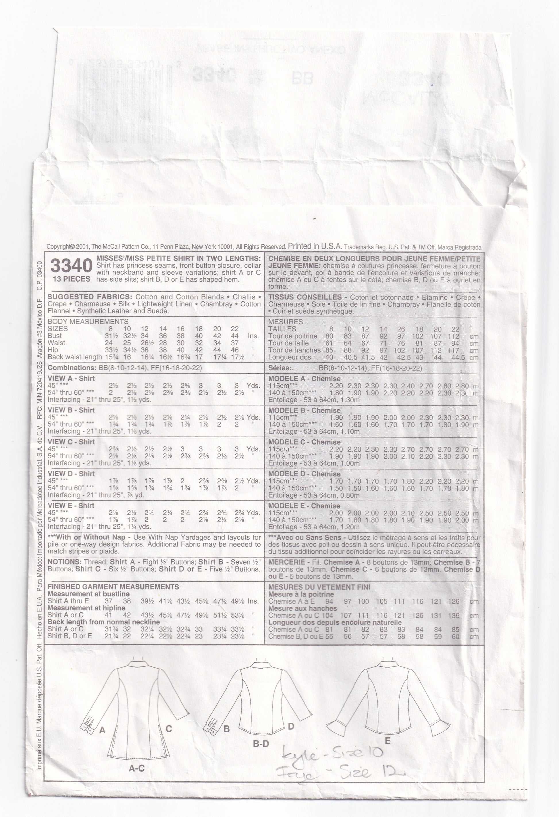 McCall's 3340 Womens Princess Cut Longline or Regular Length Shirts Out Of Print Paper Sewing Pattern Sizes 8 - 14 UNCUT Factory Folded