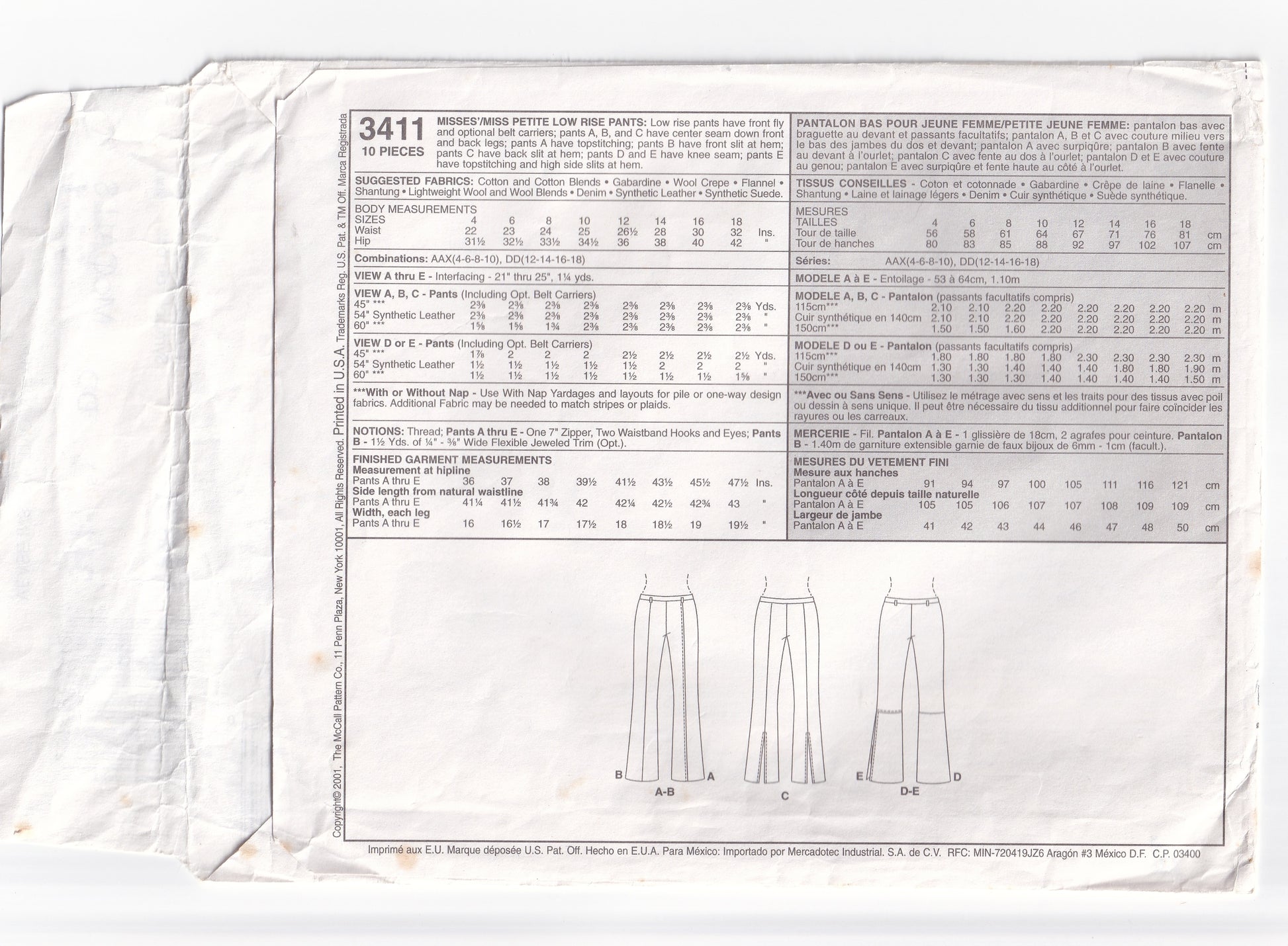 McCall's 3411 Womens Low Rise Pants Out Of Print Sewing Pattern Sizes 12 - 18 UNCUT Factory Folded