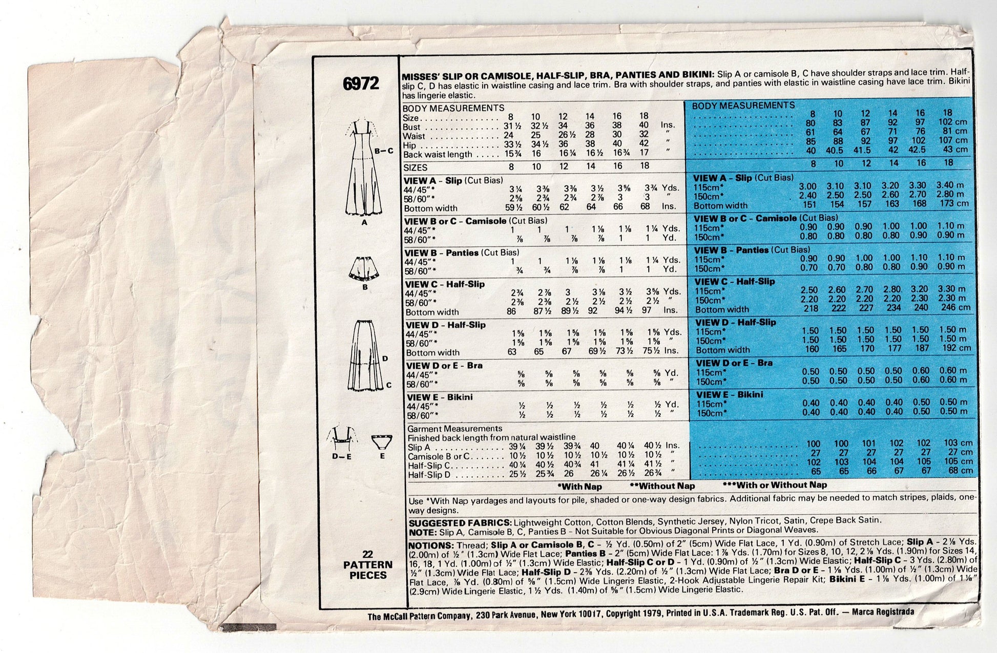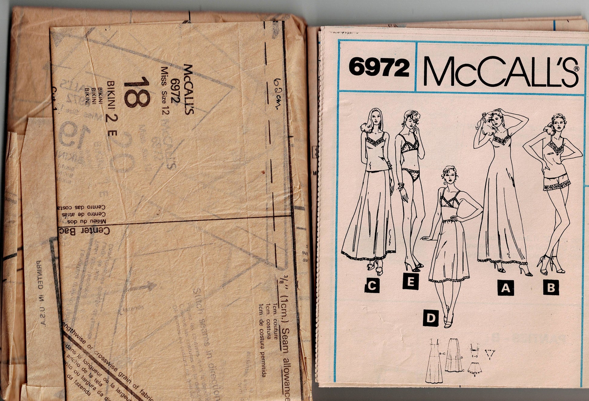 McCall's 6972 Womens Slips Camisole Bra Panties & Bikini 1970s Vintage Sewing Pattern Size 12 Bust 34 Inches