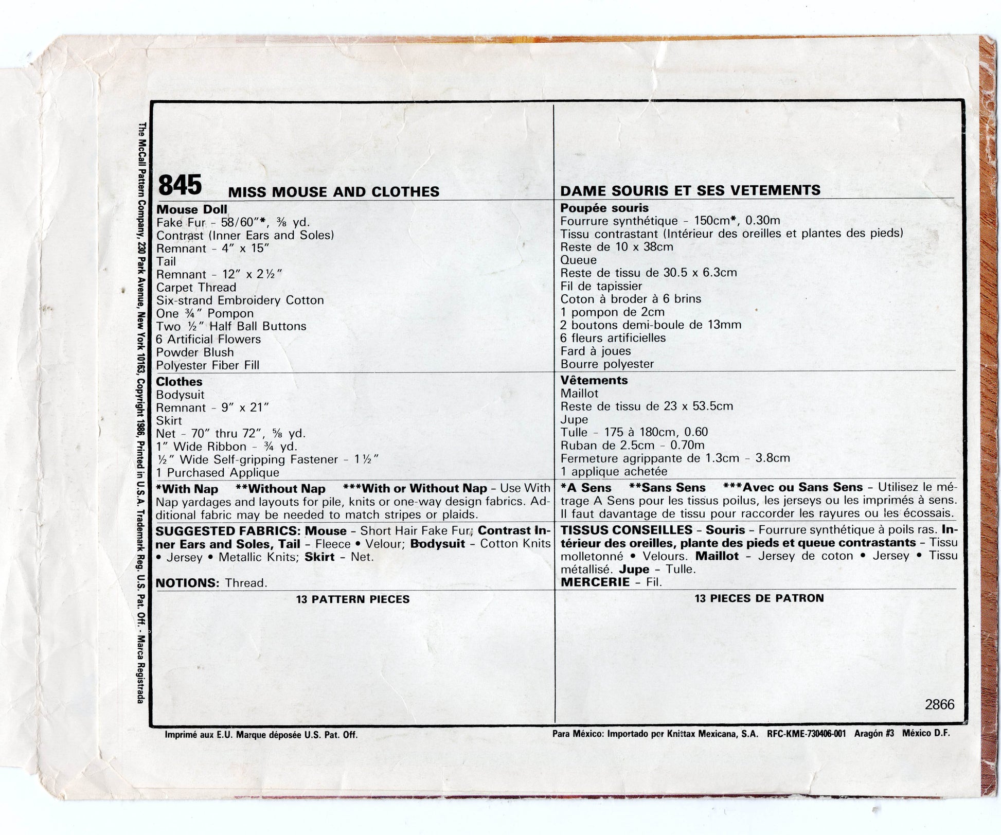 McCall's 845 Stuffed Mouse Toy with Clothing 1980s Vintage Sewing Pattern UNCUT Factory Folded