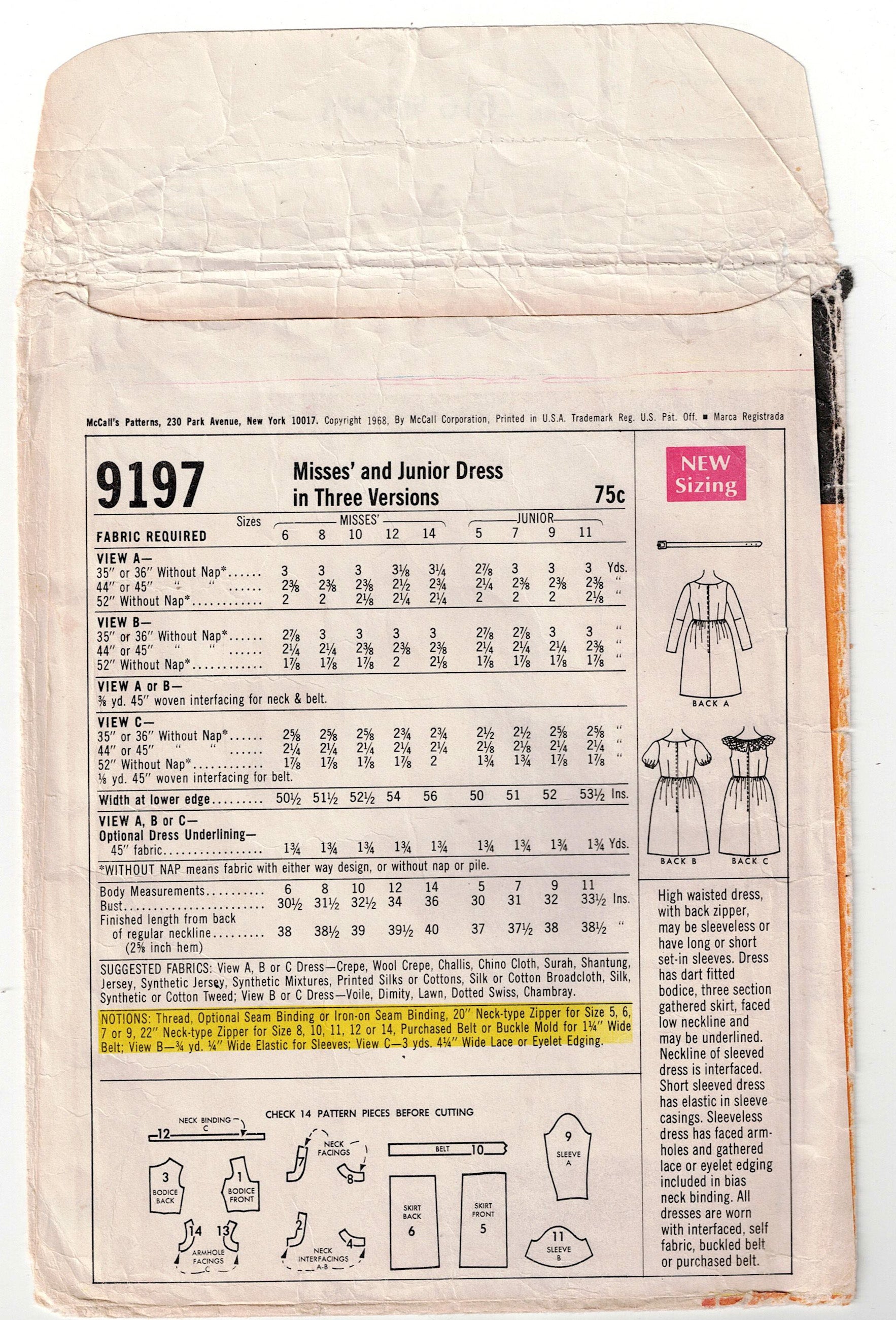 McCall's 9197 Womens High Waisted Dress in 3 Versions 1960s Vintage Sewing Pattern Size 12 Bust 34 inches