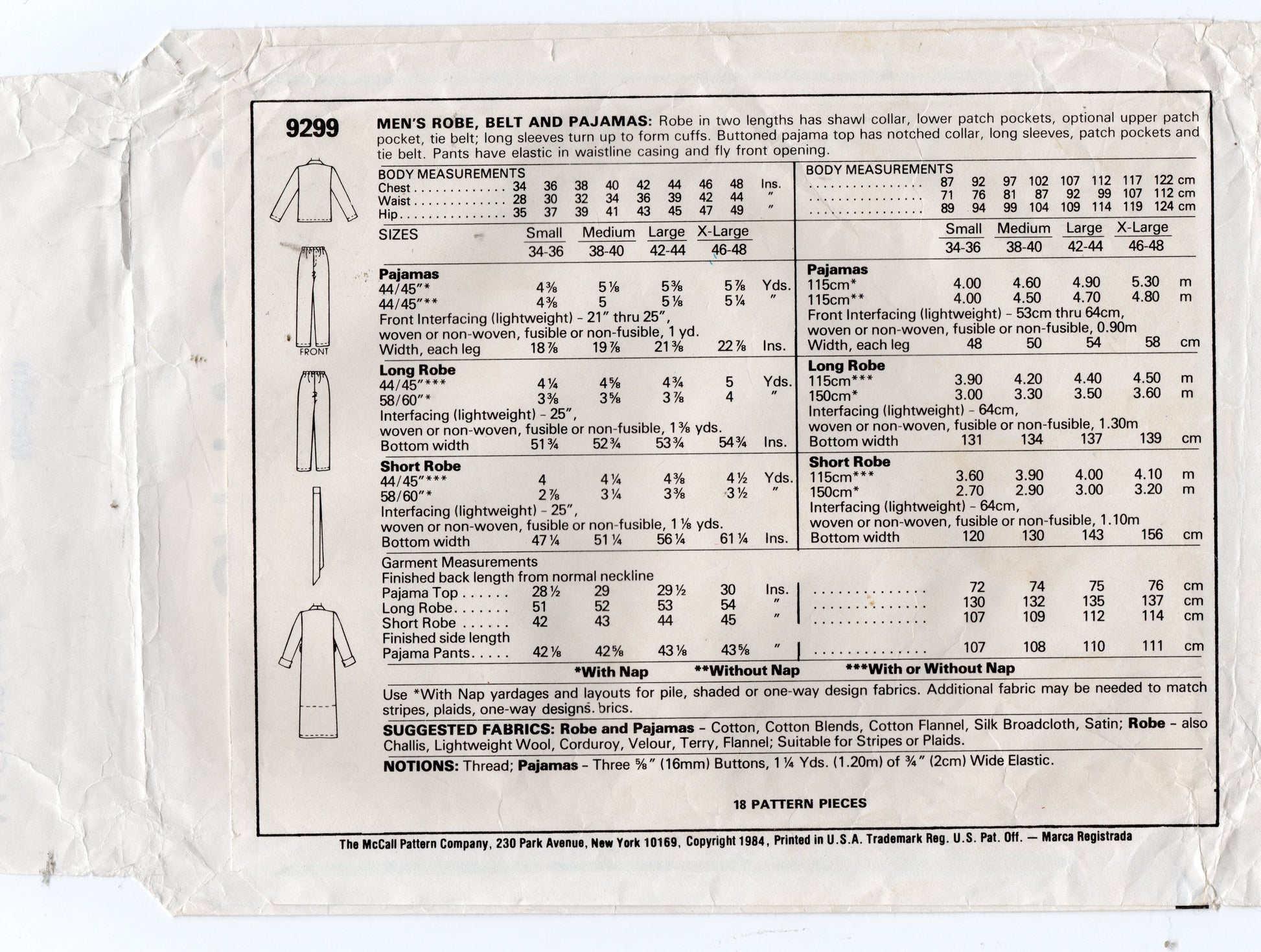 McCall's 9299 Mens Robe & Pajamas 1980s Vintage Sewing Pattern Size MEDIUM Chest 38 - 40 inches