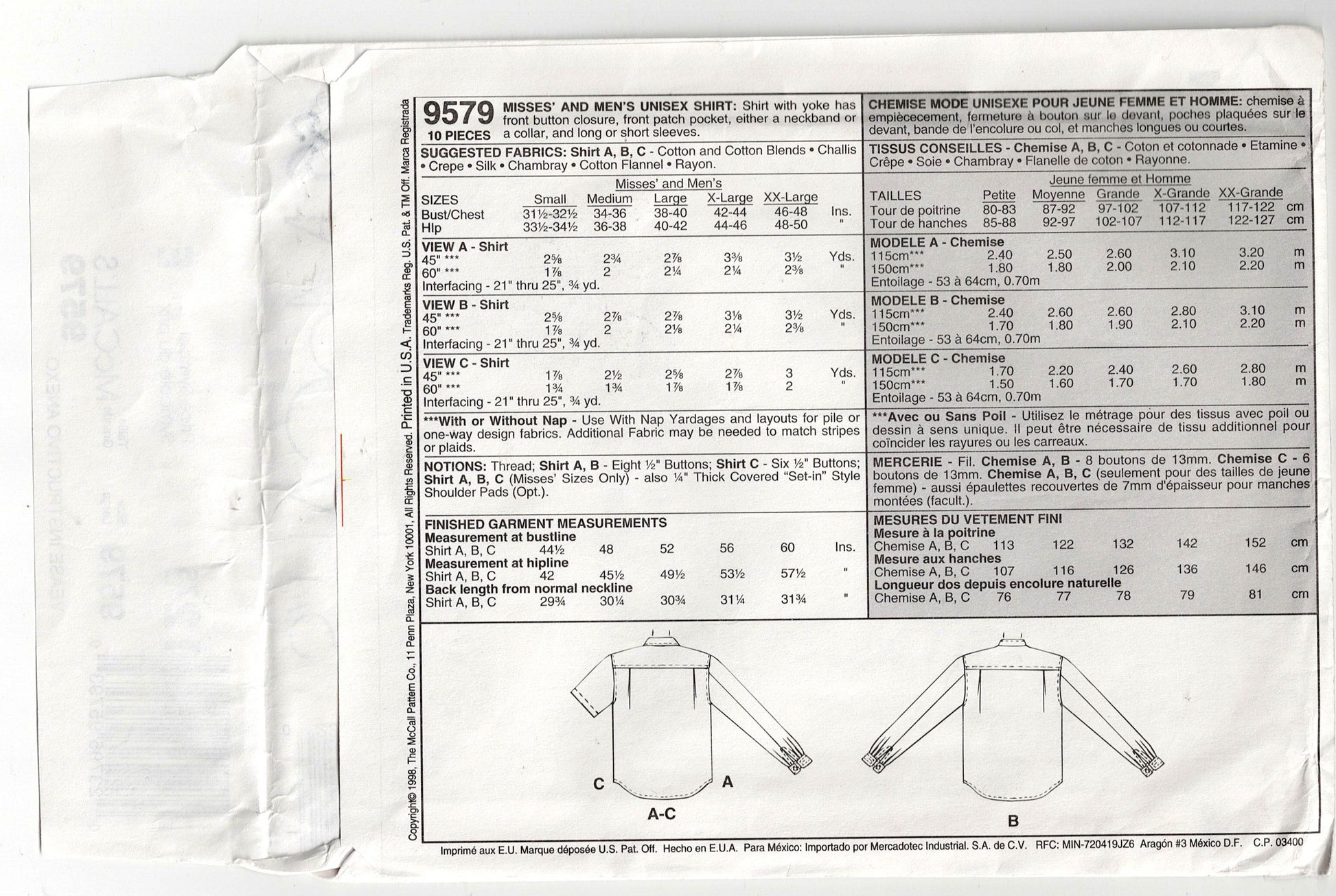 McCall's 9579 Mens Womens Palmer Pletsch UNISEX Basic Button Front Shirt 1990s Vintage Sewing Pattern Bust/Chest 38-40 Inches UNCUT Factory Folded