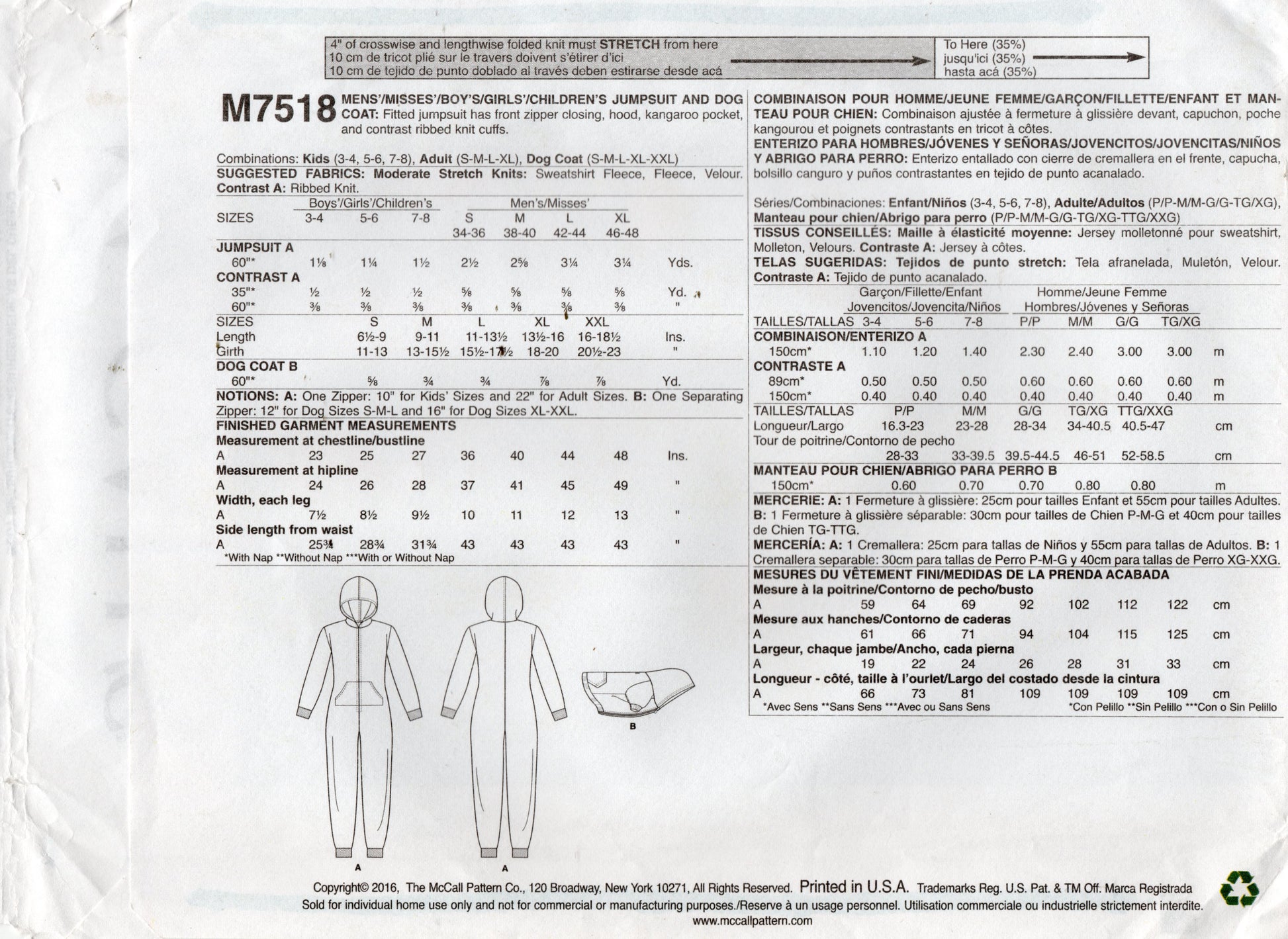 McCall's M7518 UNISEX Stretch Knit Sleep Jumpsuit & Dog Coat Sewing Pattern Size ADULT S - XL UNCUT Factory Folded