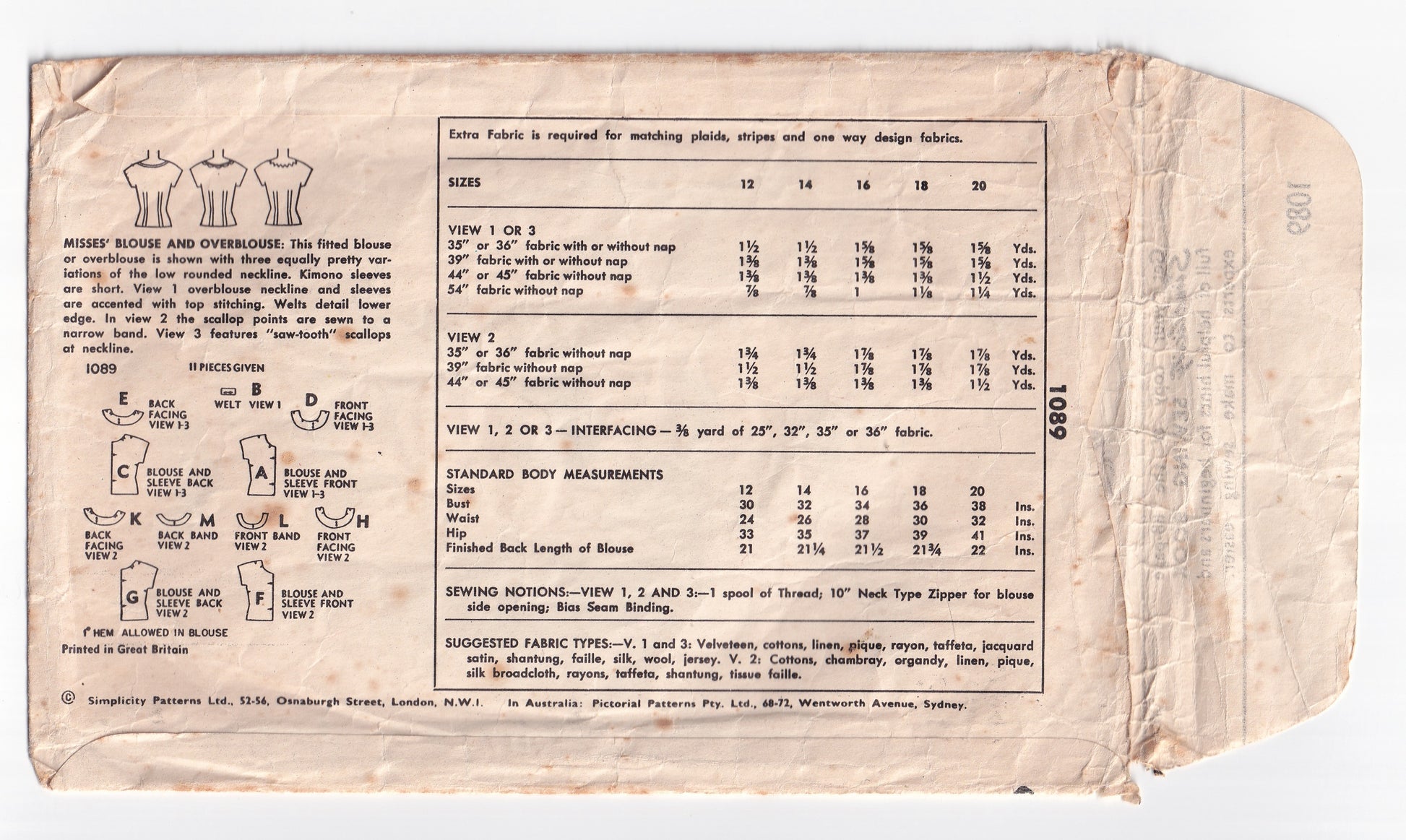 Simplicity 1089 Womens Fitted Kimono Sleeved Blouse & Overblouse 1950s Vintage Paper Sewing Pattern Size 16 Bust 34 inches