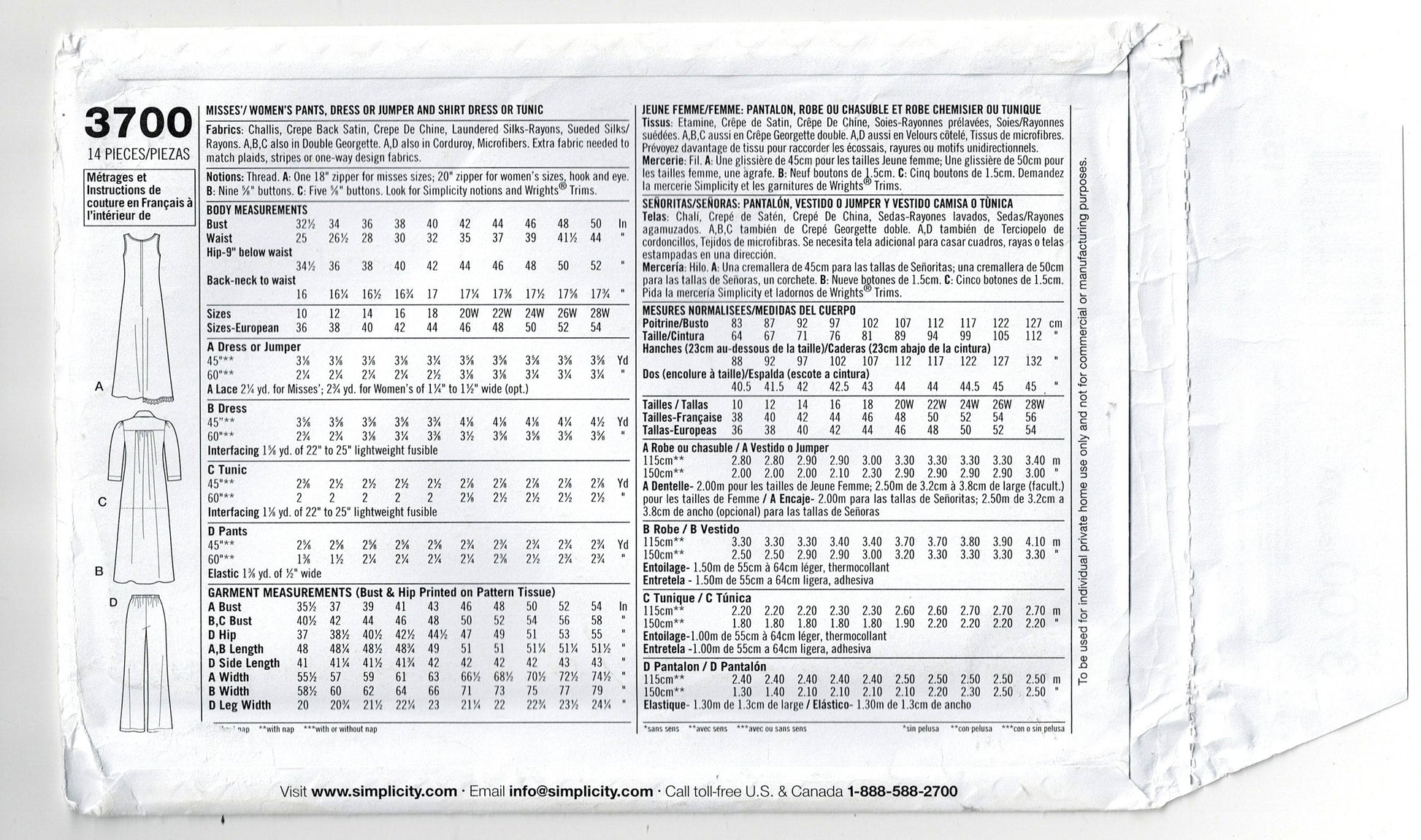 Simplicity 3700 sewing pattern, dated 2020, now out of print.
