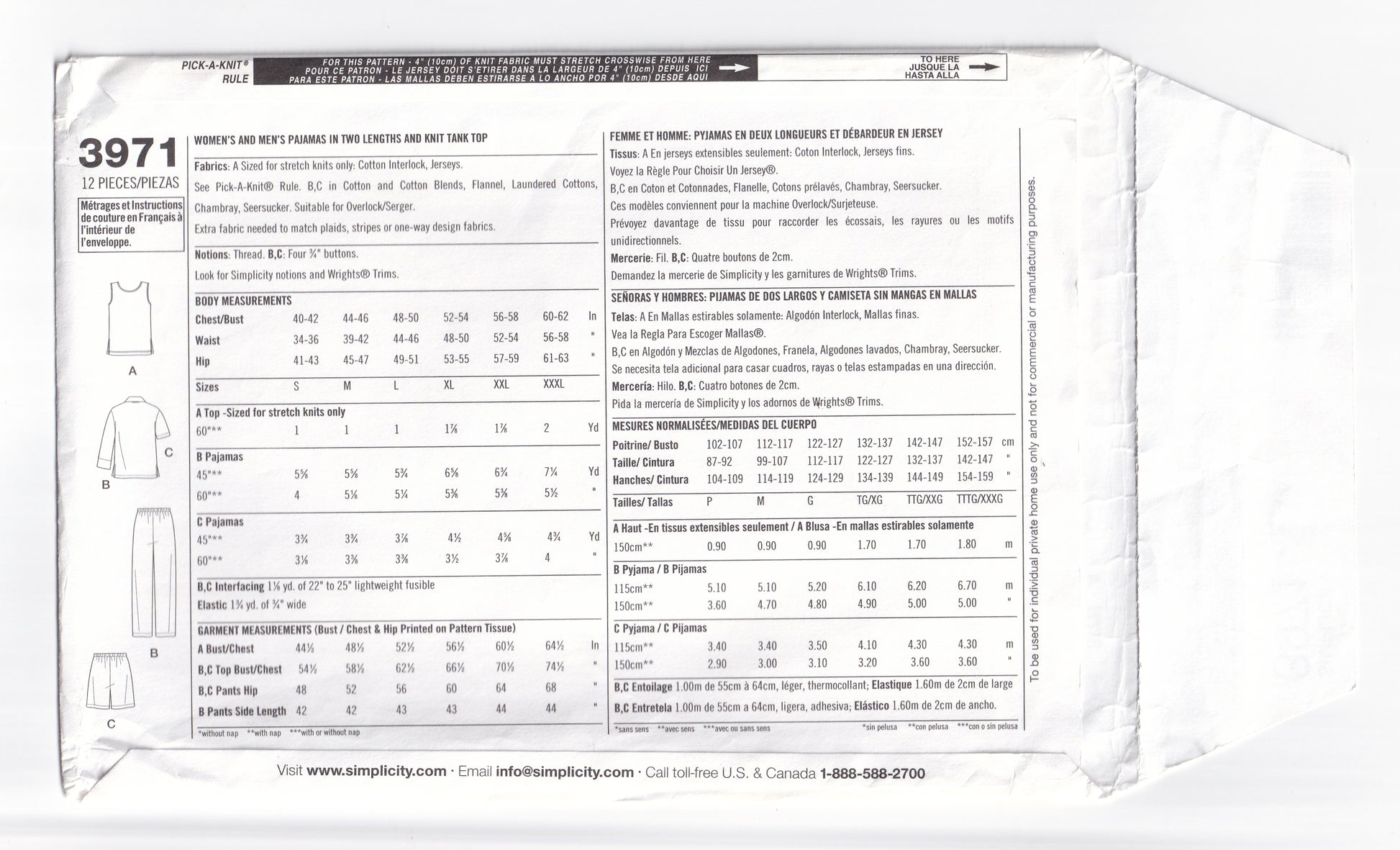 Simplicity 3971 Mens Womens UNISEX Plus Size Cozywear Pyjamas & Tank Top Paper Sewing Pattern Size S/M/L UNCUT Factory Folded