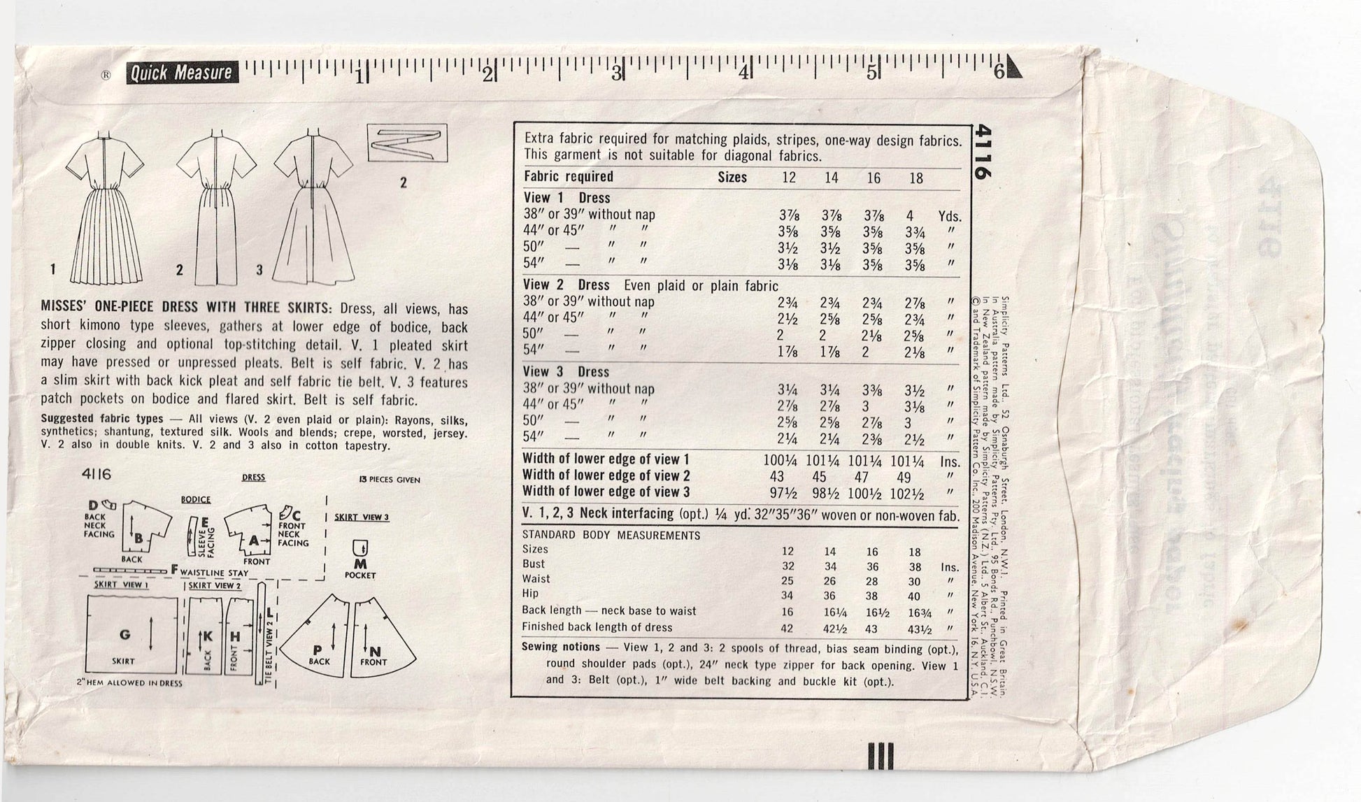 Simplicity 4116 Womens Slim Kimono Sleeved Dress with 3 Skirts 1960s Vintage Sewing Pattern Size 16 Bust 36 inches UNUSED Factory Folded