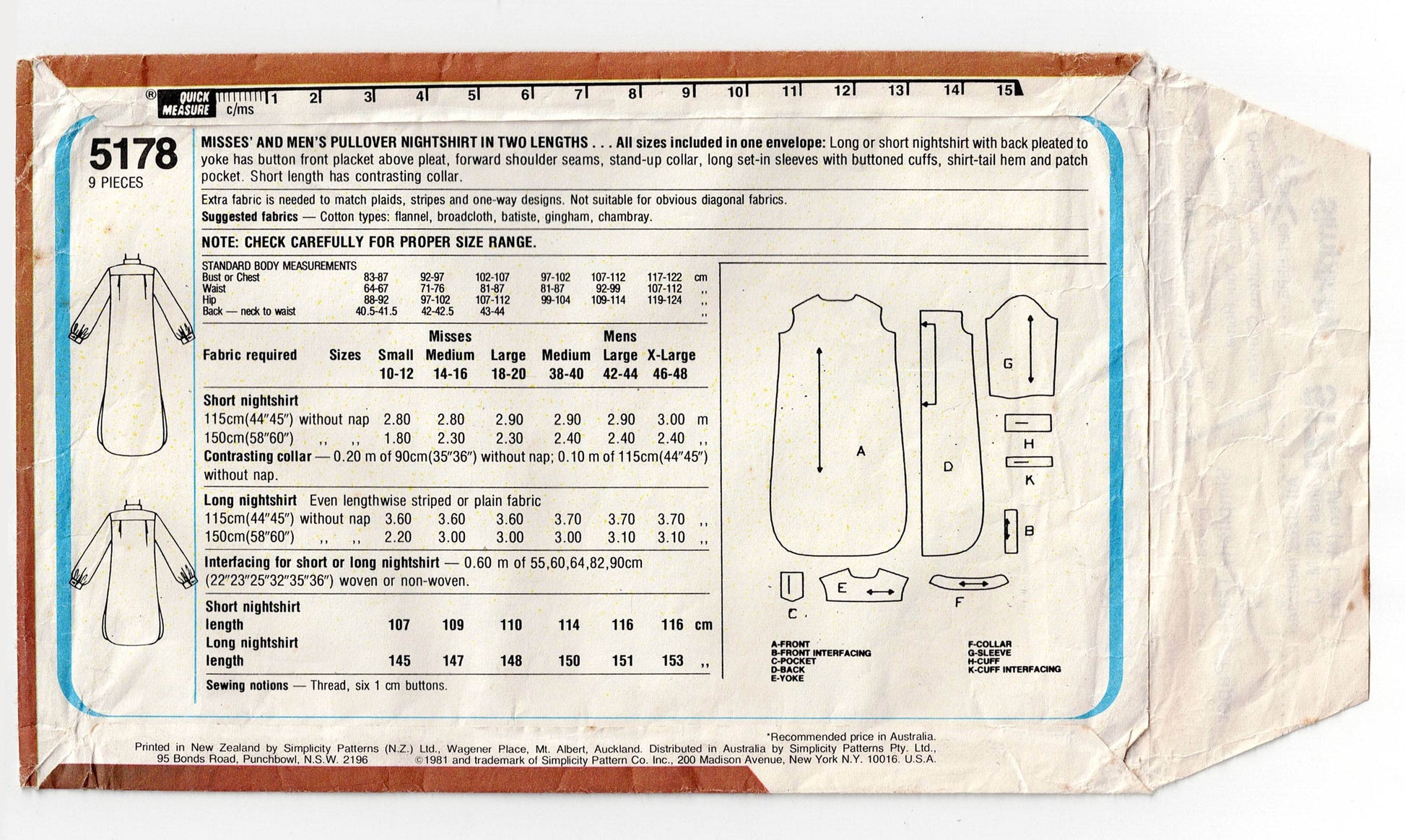Simplicity 5178 UNISEX Nightshirt 1980s Vintage Sewing Pattern Size 10 - 20 Womens & Chest 38 - 40 Mens