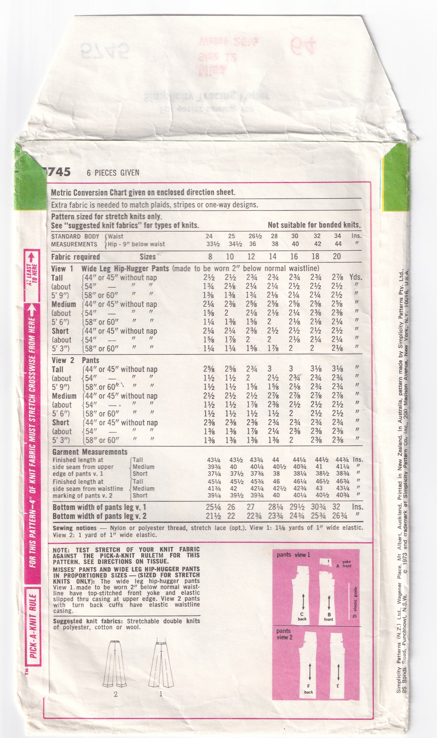 Simplicity 5745 Womens Stretch Knit Pants & Wide Leg Hip Hugger Flares in Short Regular or Tall 1970s Vintage Paper Sewing Pattern Size 12 Waist 26.5 Inches