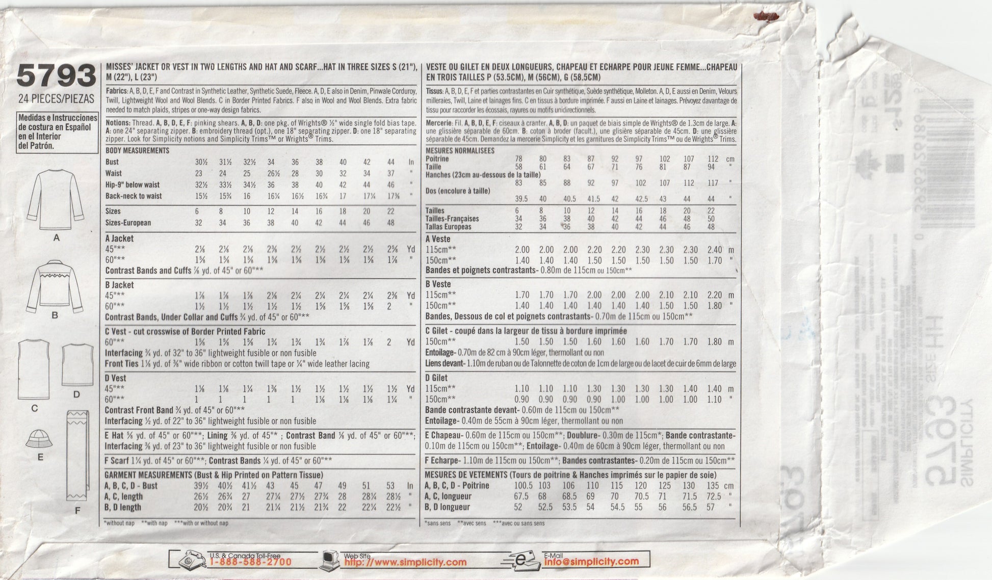 Simplicity 5793 Womens Winter Vest Jacket Scarf & Hat Out Of Print Paper Sewing Pattern Size 6 - 12 UNCUT Factory Folded