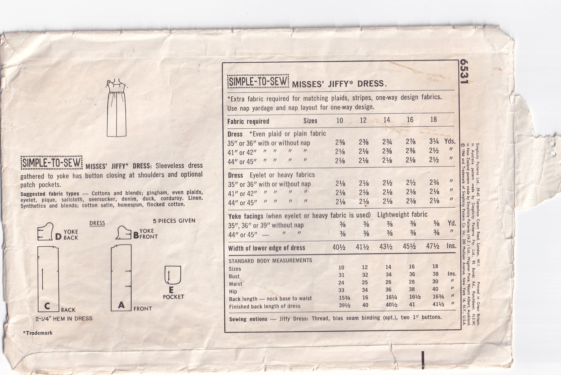 Simplicity 6531 vintage sewing pattern, dated 1966.