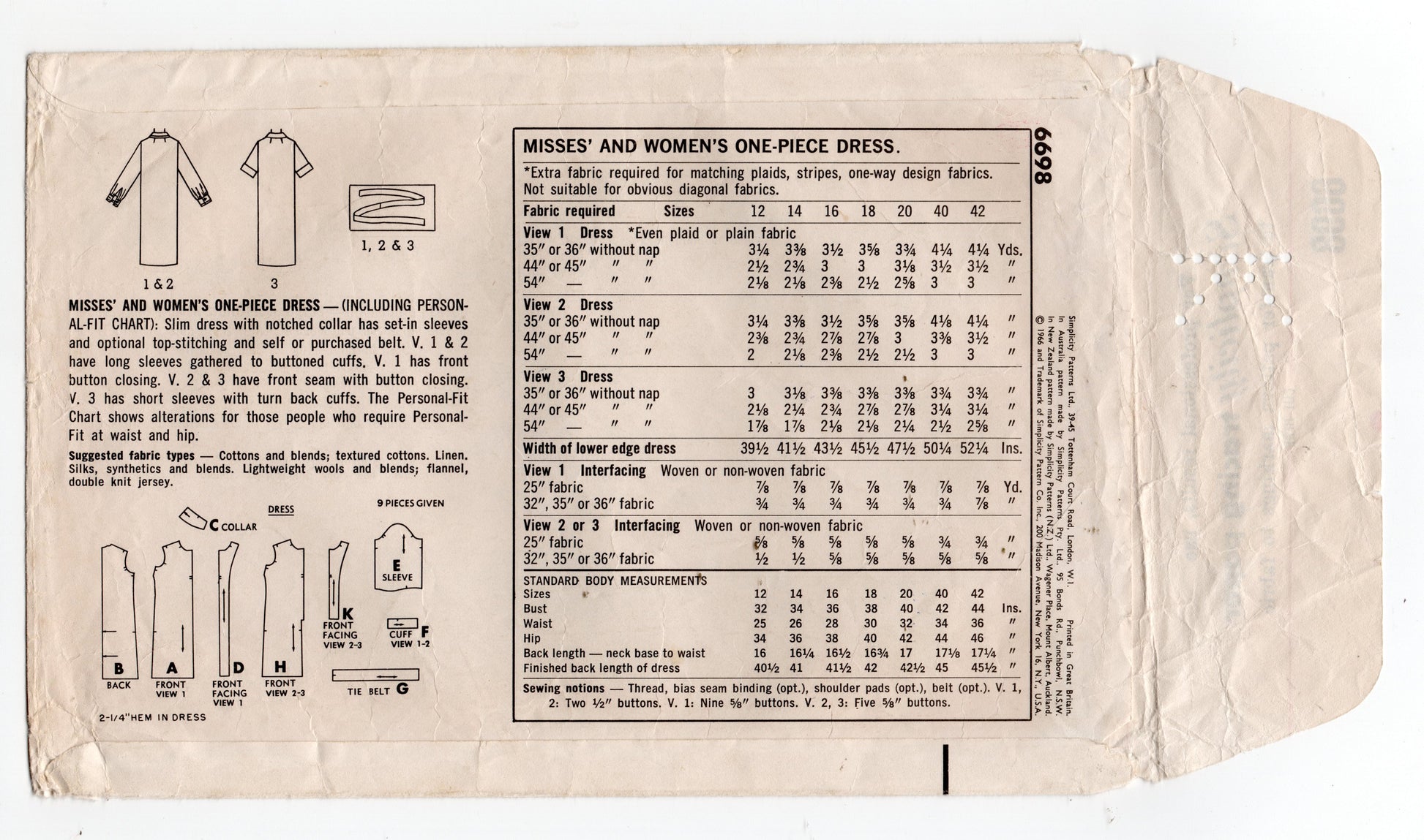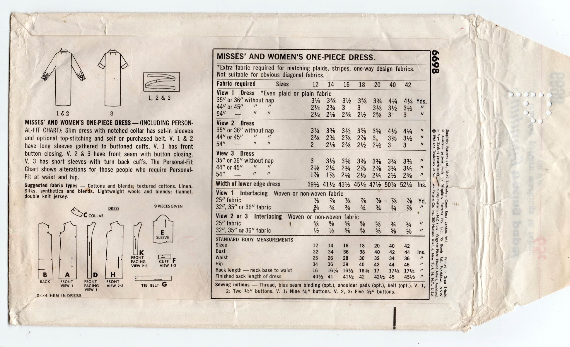 Simplicity 6698 Vintage Sewing Pattern, dated 1966.