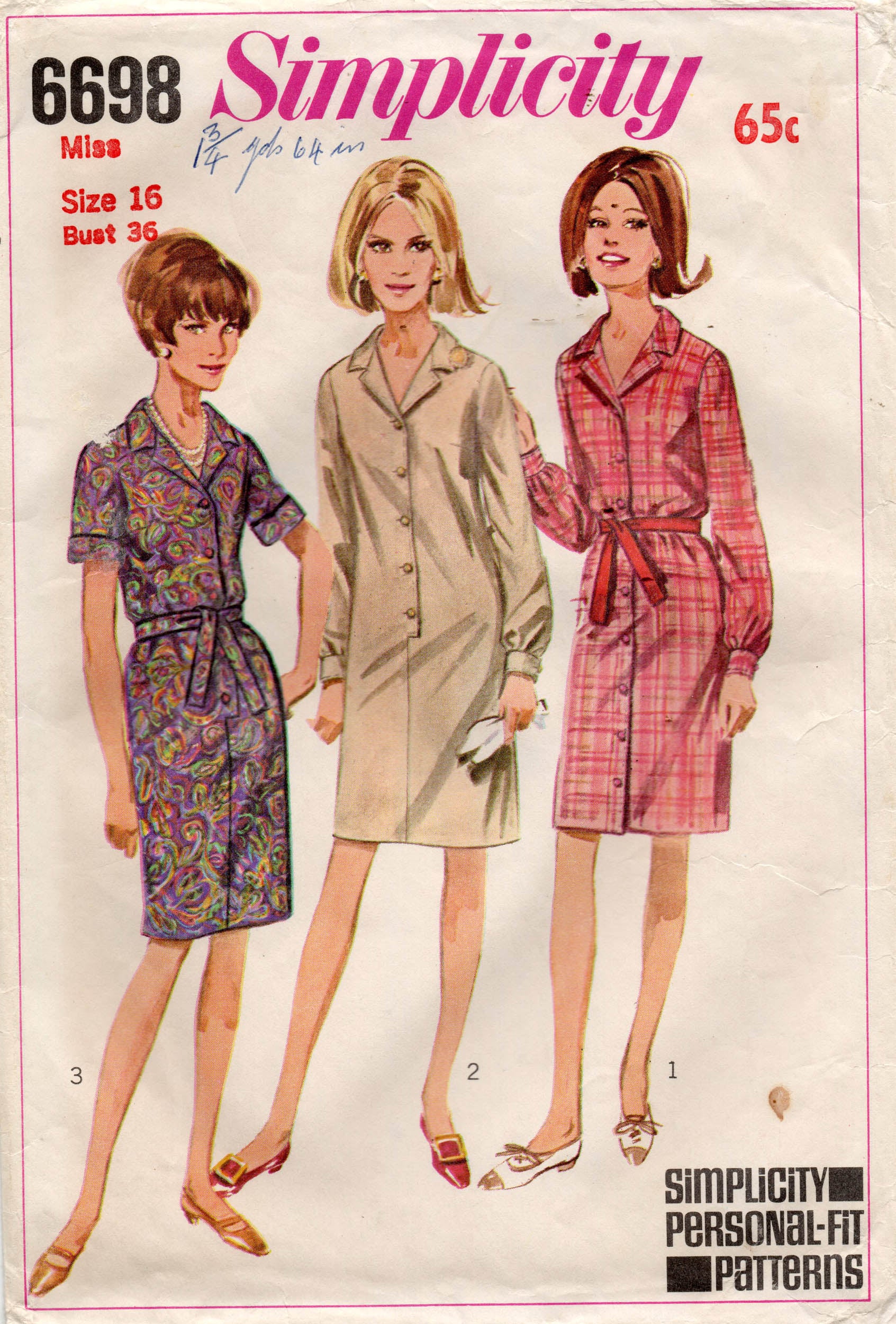 Simplicity 6698 Womens Classic Shirtdress 1960s Vintage Sewing Pattern Bust 34 or 36 inches